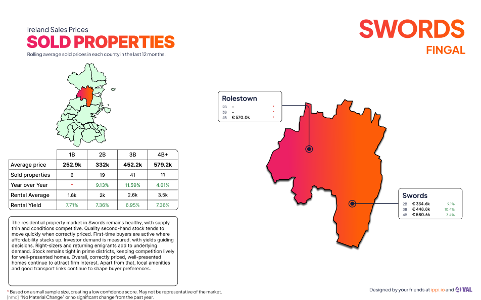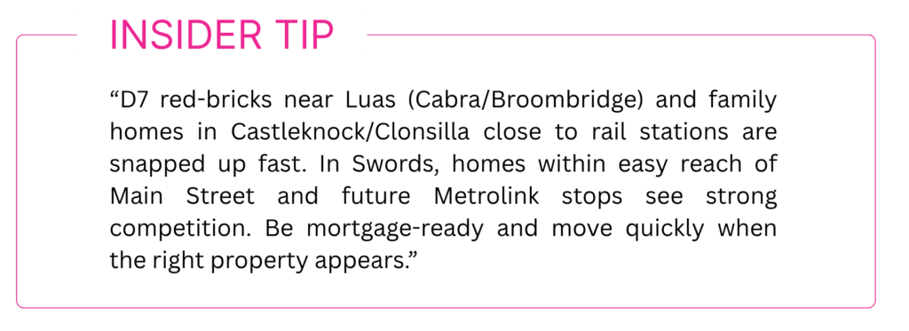 Family Movement – Many upsizers seek 3–4 bed homes in Castleknock or Swords, while downsizers often stay local, creating opportunities for new buyers.