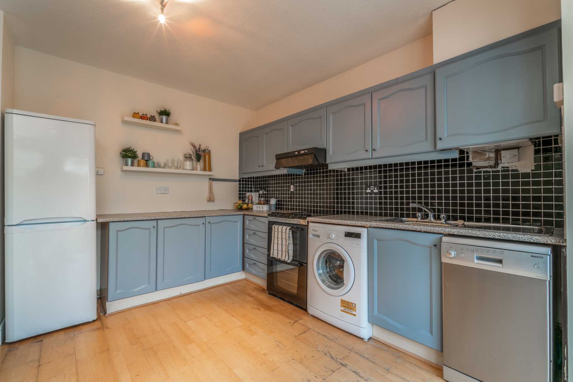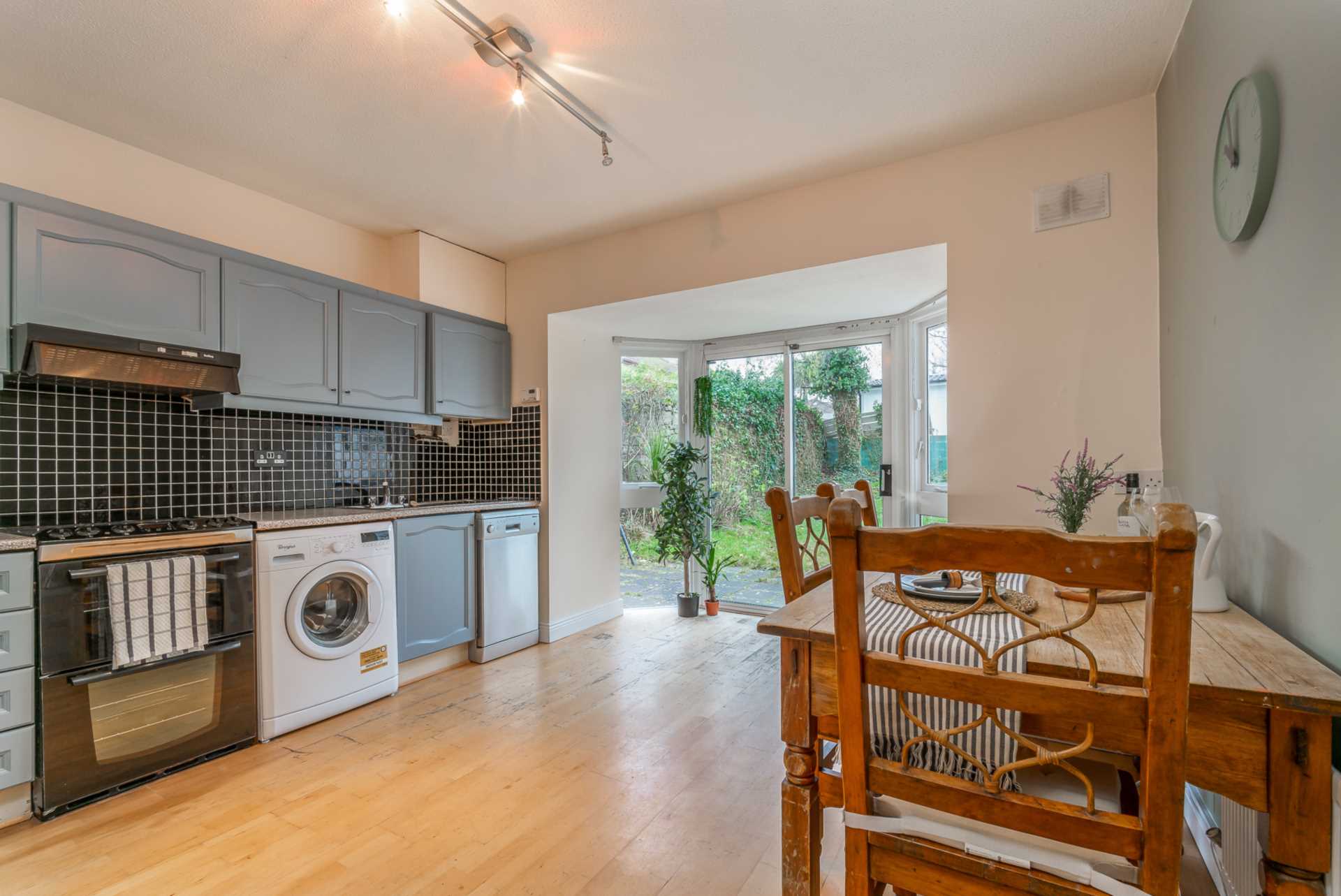 Large feature bay window with sliding PVC glazed doors to rear garden. Modern fitted kitchen. Tiled floor.
