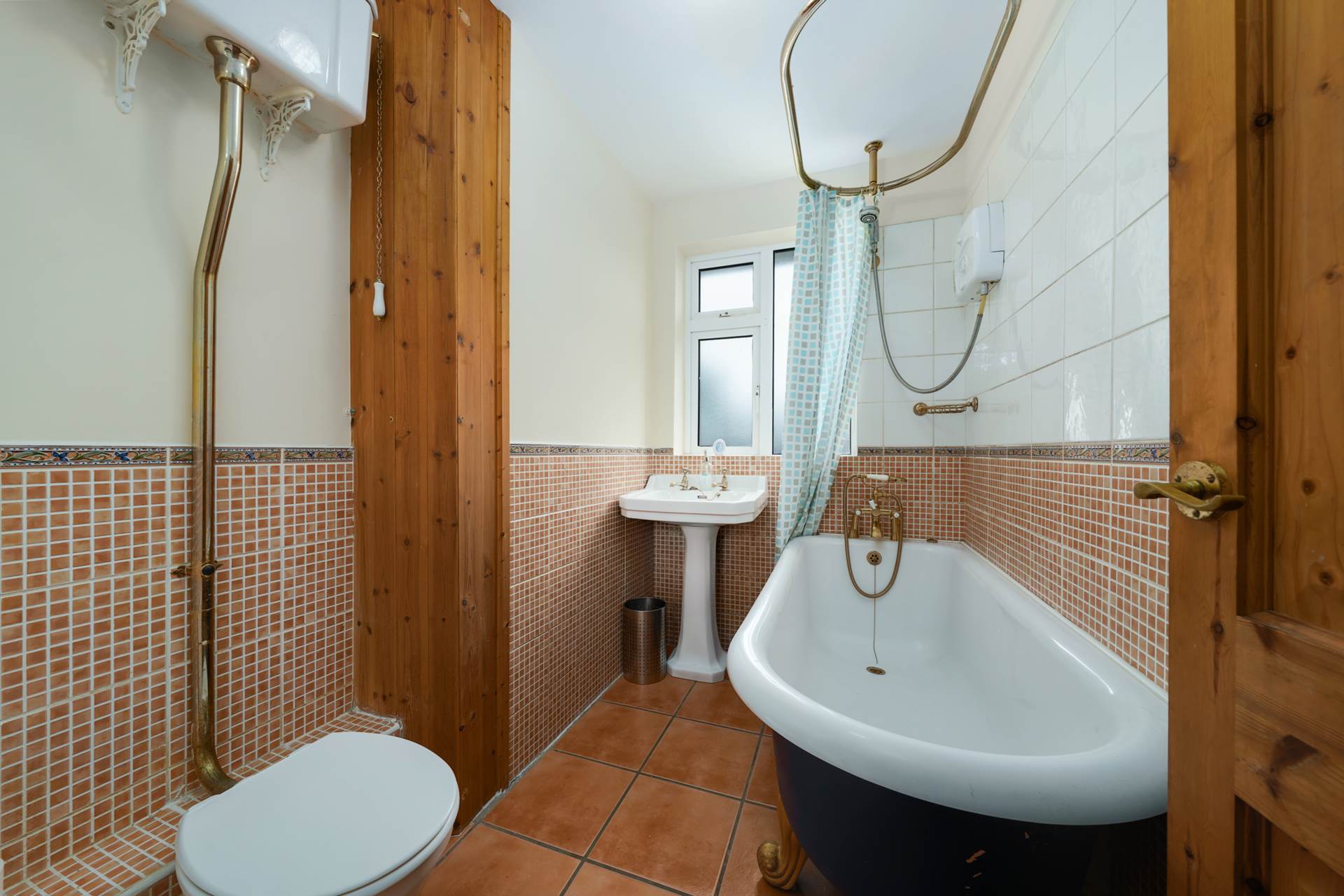 Cast iron traditional-style bathtub, brass fittings, W.C., W.H.B., power shower, pine fittings, tiled floor and walls.