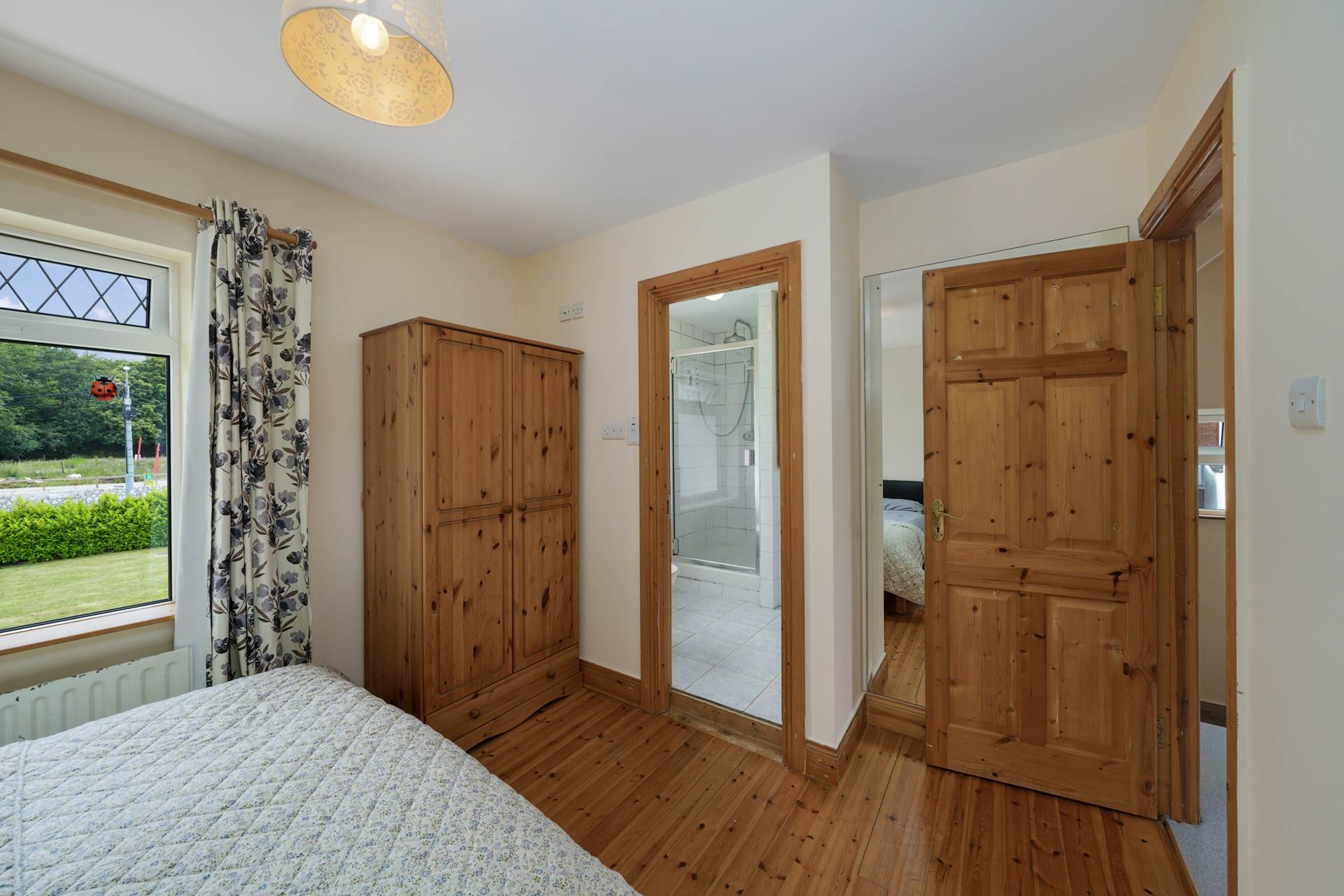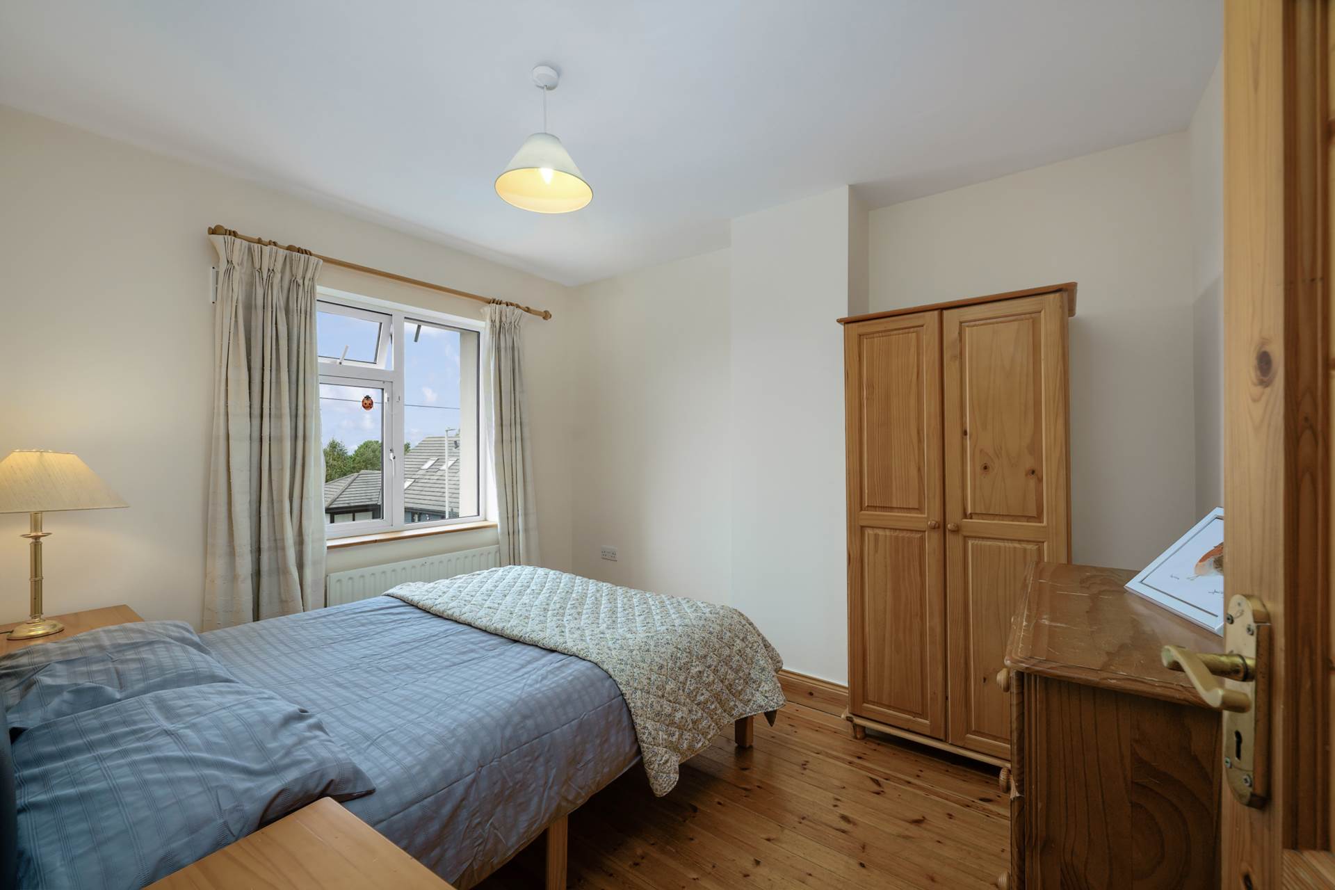 Pine floor, pine trim, light fitting. curtains.