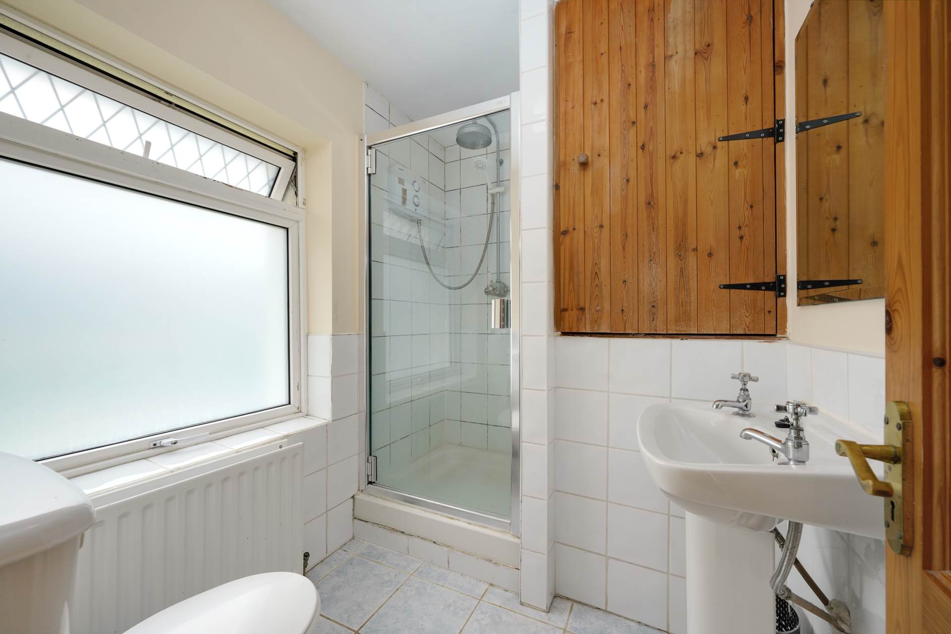 W.C., W.H.B., shaving light, light fitting, tiled floor and walls, power shower, separate high-volume shower head fed from the tank, storage closet, frosted glass wiindow.