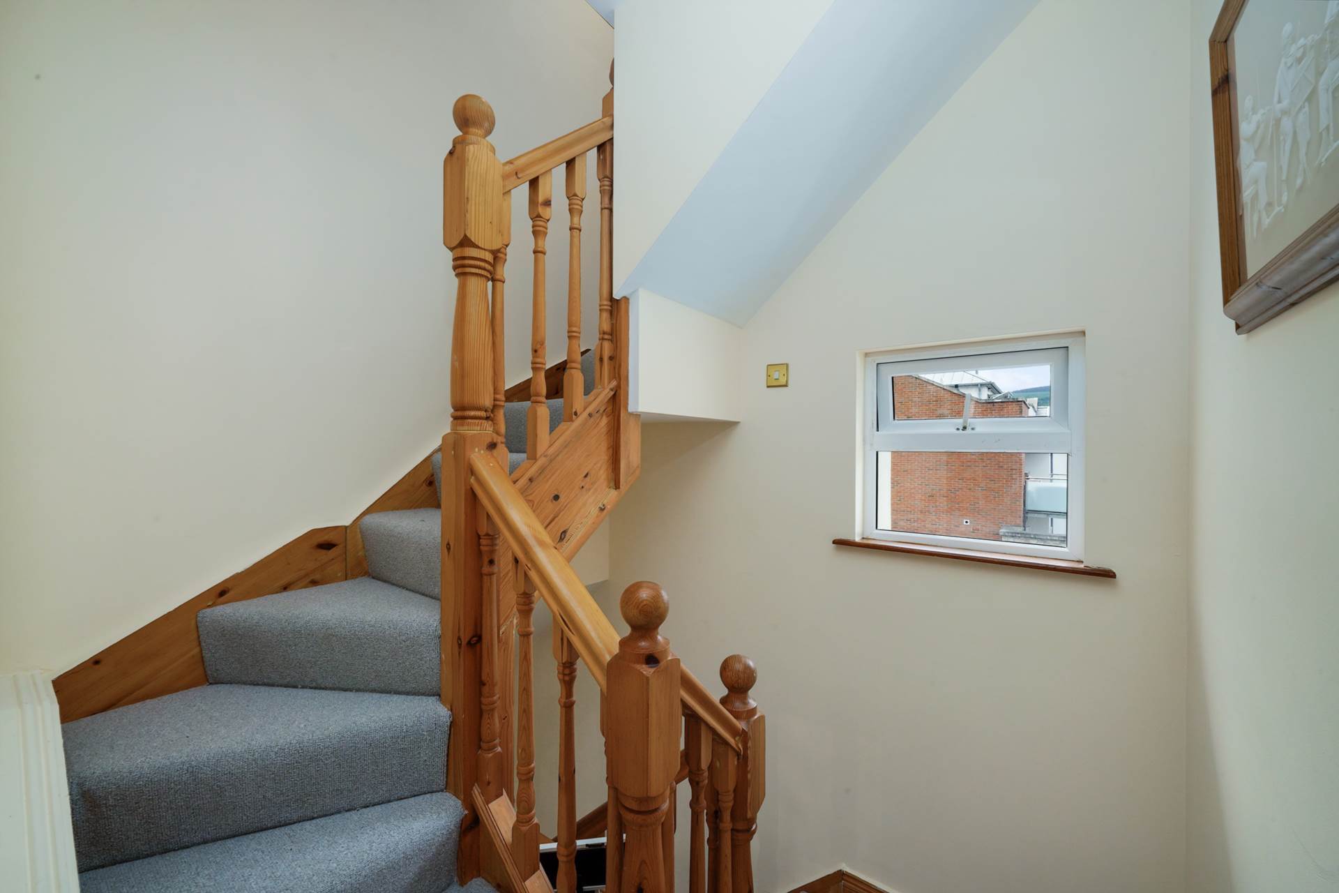 Proper stairs lead to a fully finished attic room with two velux skylights, ideal as a playroom, home office or store room.