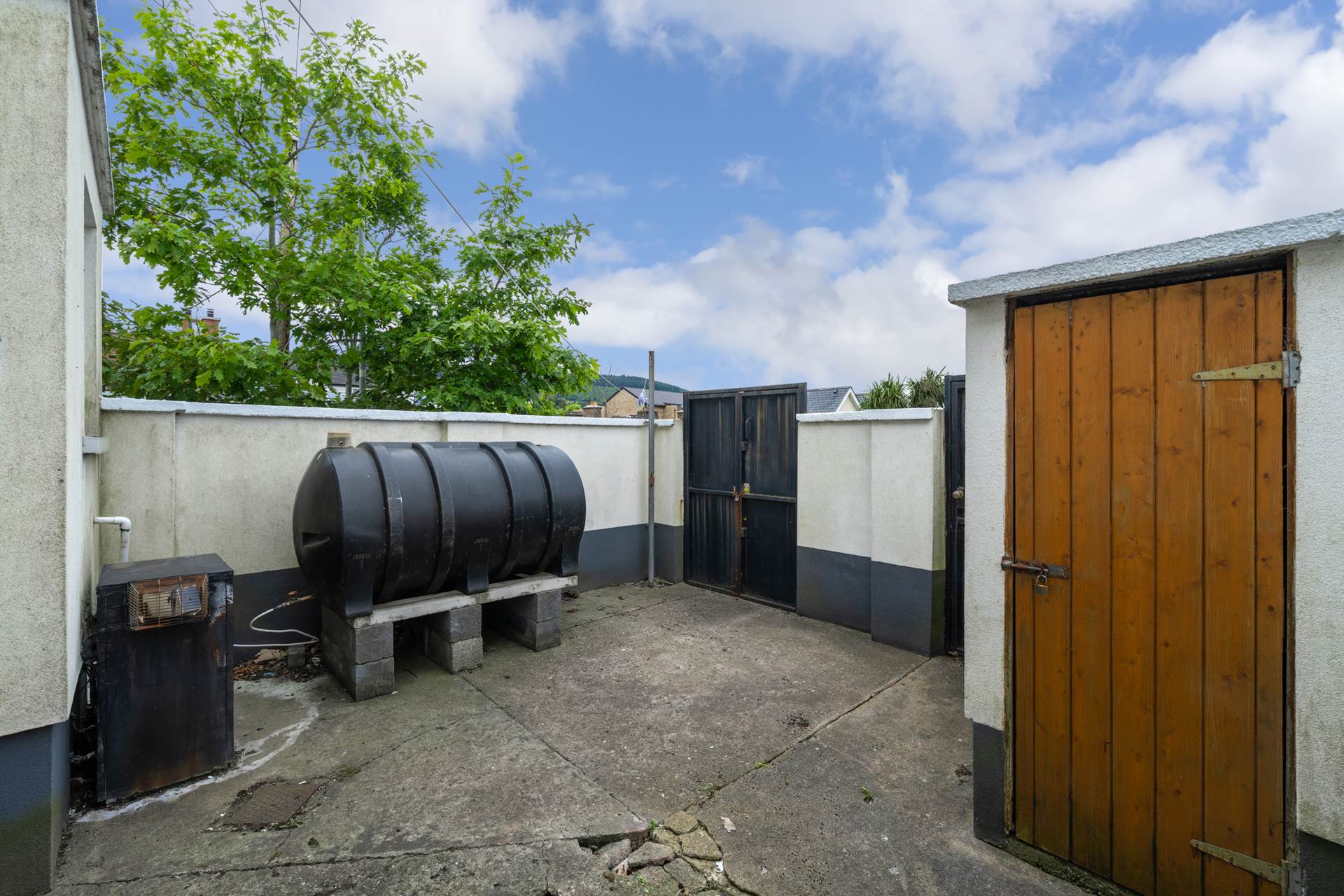 Concrete back yard with rear access gate and block built shed. The large oil tank and oil boiler could be removed if the heating was updated to gas or to a heat pump system. If this was done there would be space to park one or two vans or EVs in the back yard. There would also be space to extend the kitchen to the rear by a couple of metres to maximise the kitchen/dining space and bring in more light to the rear of the property.
