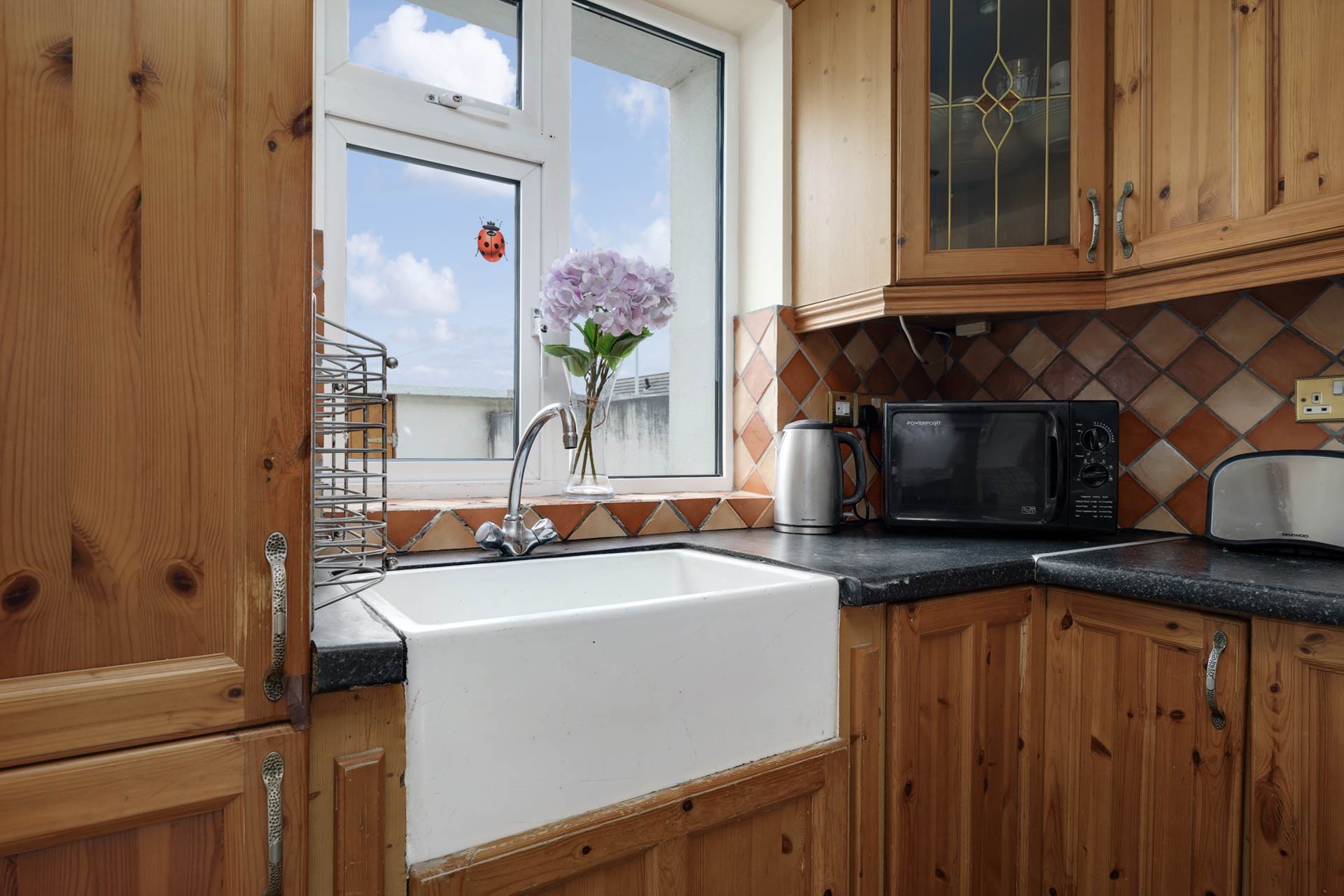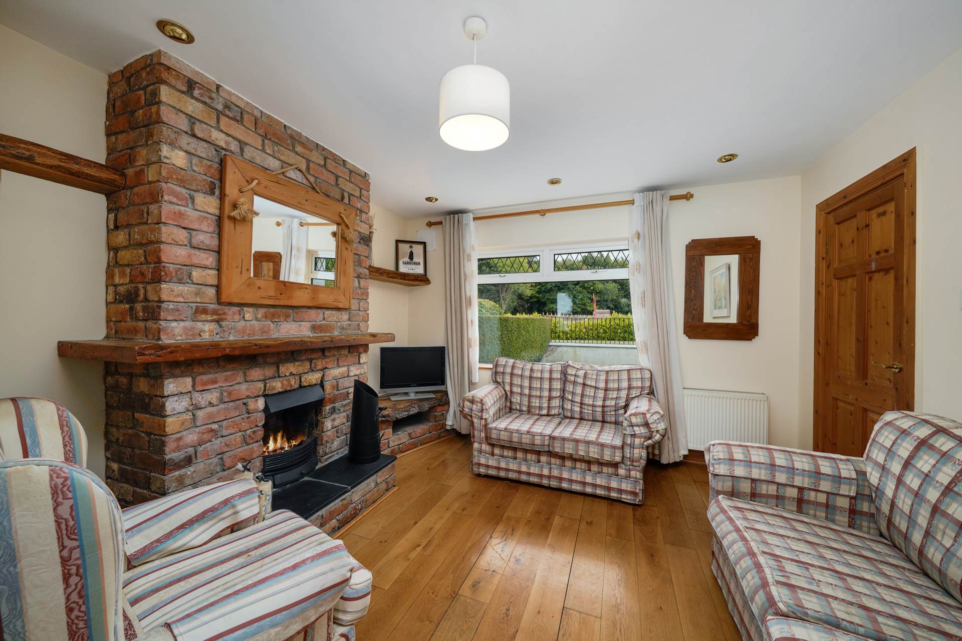 High-quality pine fitted kitchen, integrated pine-front fridge/freezer, Belfast sink with tiled splashback, extractor fan with copper hood, wine rack, crystal display cabinets, polished French oak floor, Belfast brick fireplace with slate hearth, natural oak shelving, natural flame gas fire, salvaged church timber mantel and arch, old-style cast-iron radiators, TV point, curtains and curtain rod.