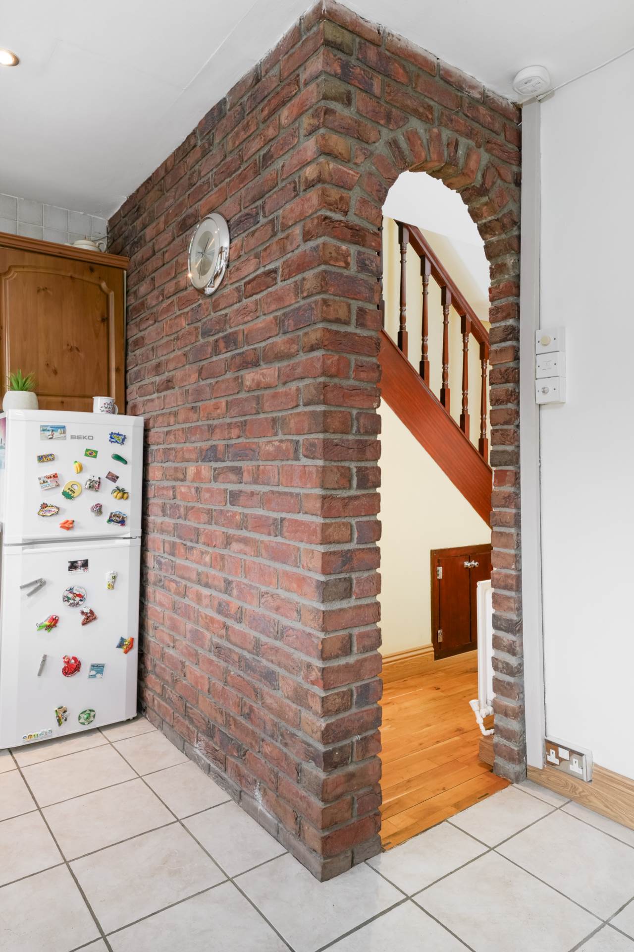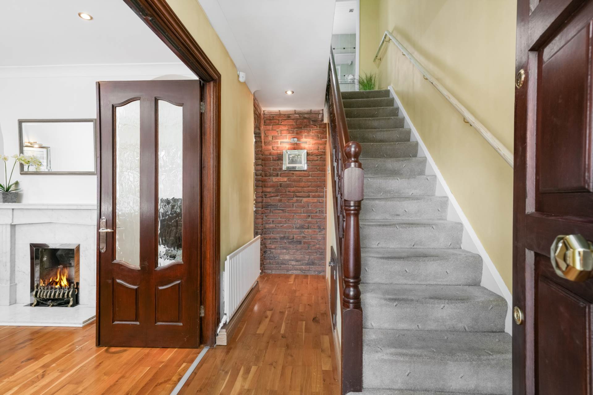 Polished, solid wood flooring. Under stairs storage. Feature red brick wall with archway opening to rear kitchen/dining room. Double doors to living room. Recessed lighting. Carpeted stairs and landing.
