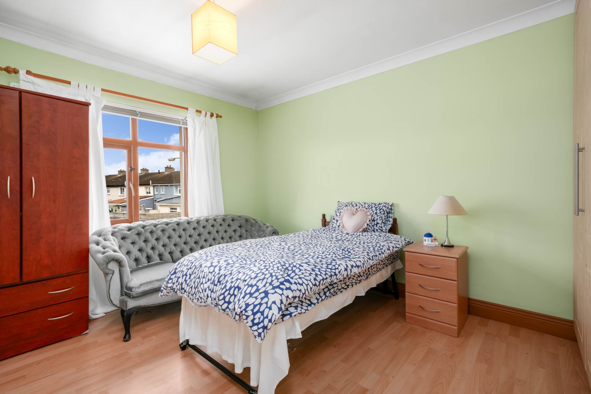 Double bedroom. Window to rear. Fitted wardrobes along one wall. Wood laminate flooring.