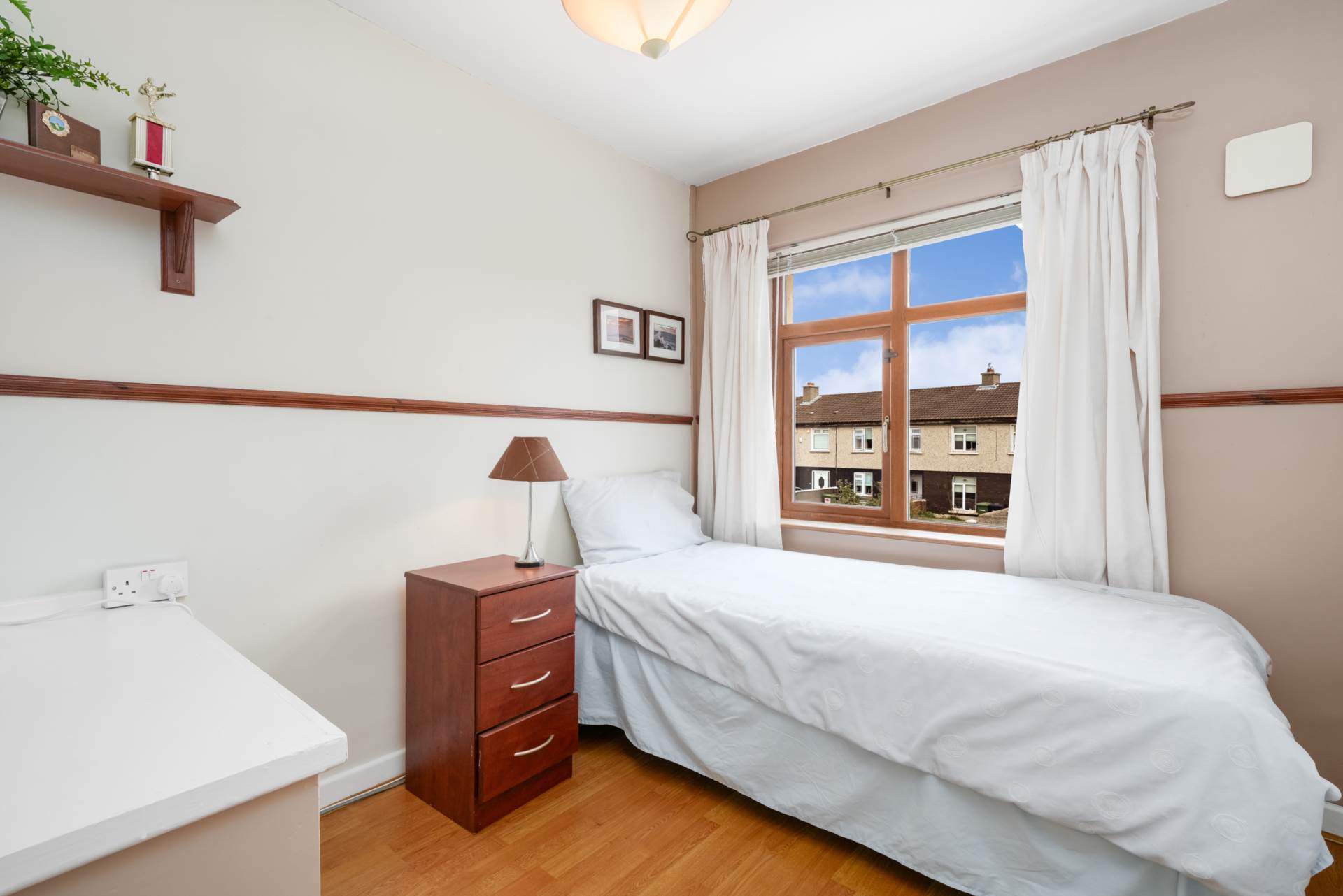 Single bedroom with window to front. Wood laminate flooring. Raised platform frequently used to support a single bed.