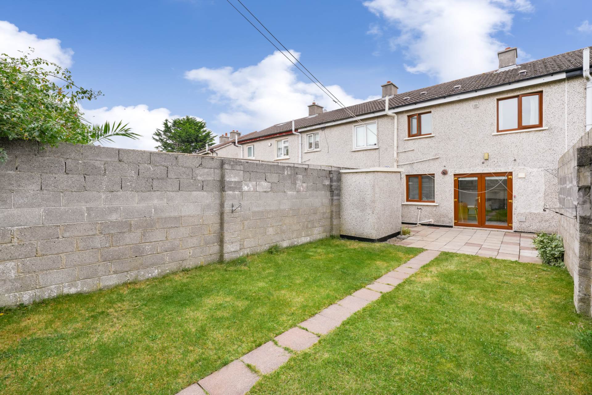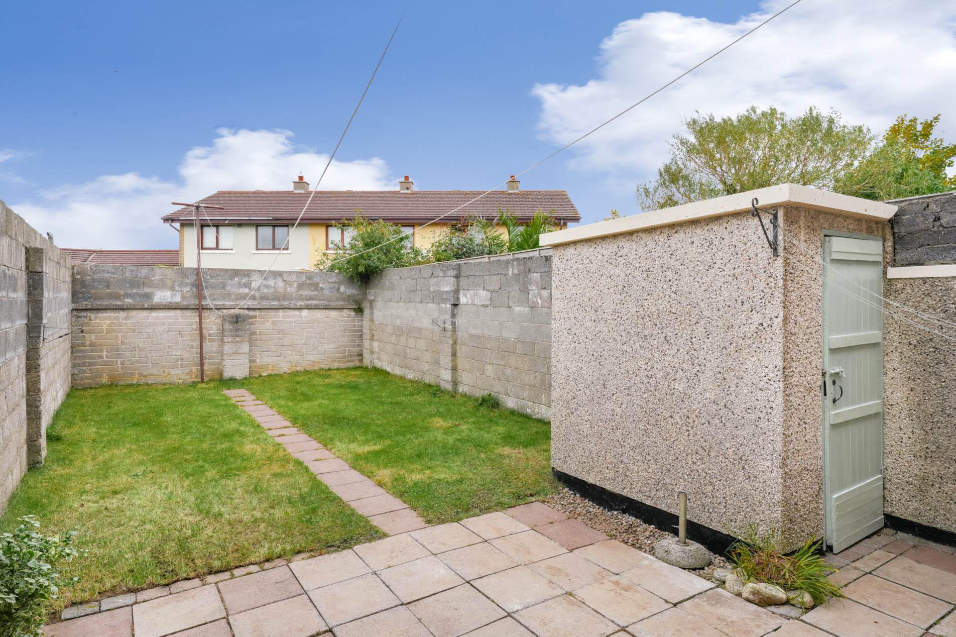 Westerly facing walled back garden, getting excellent afternoon and evening sunlight. Patio area. Neatly tended lawn. Block built shed.