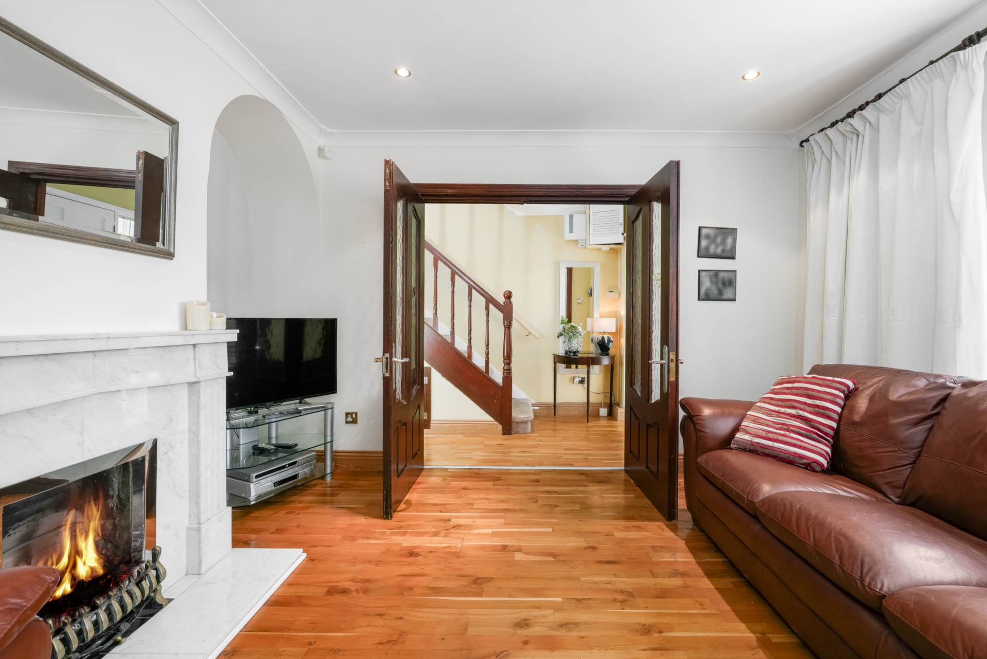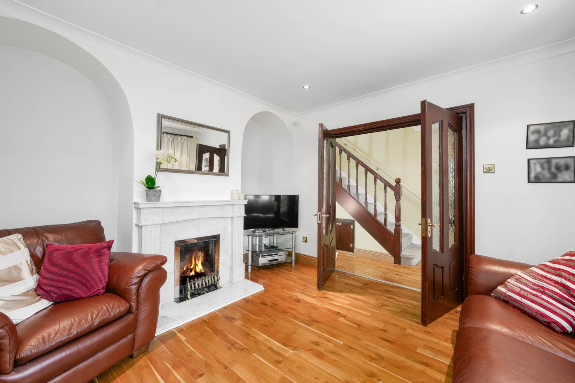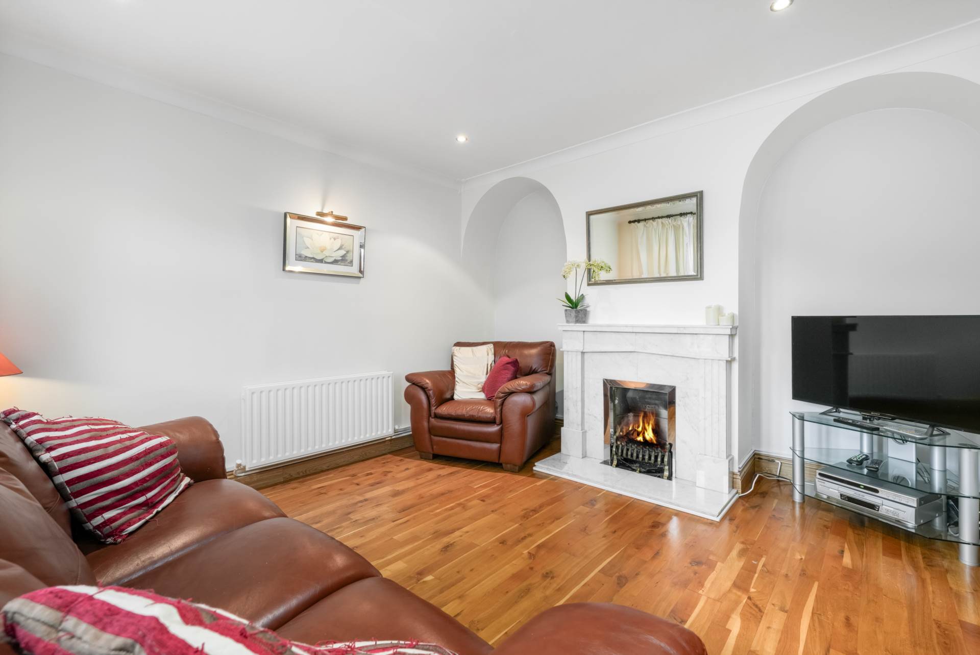 This room has a lovely feel to it with an attractive fireplace white marble flanked by two arched alcoves. Large double-glazed window to front. Solid wood flooring. Recessed lighting.
