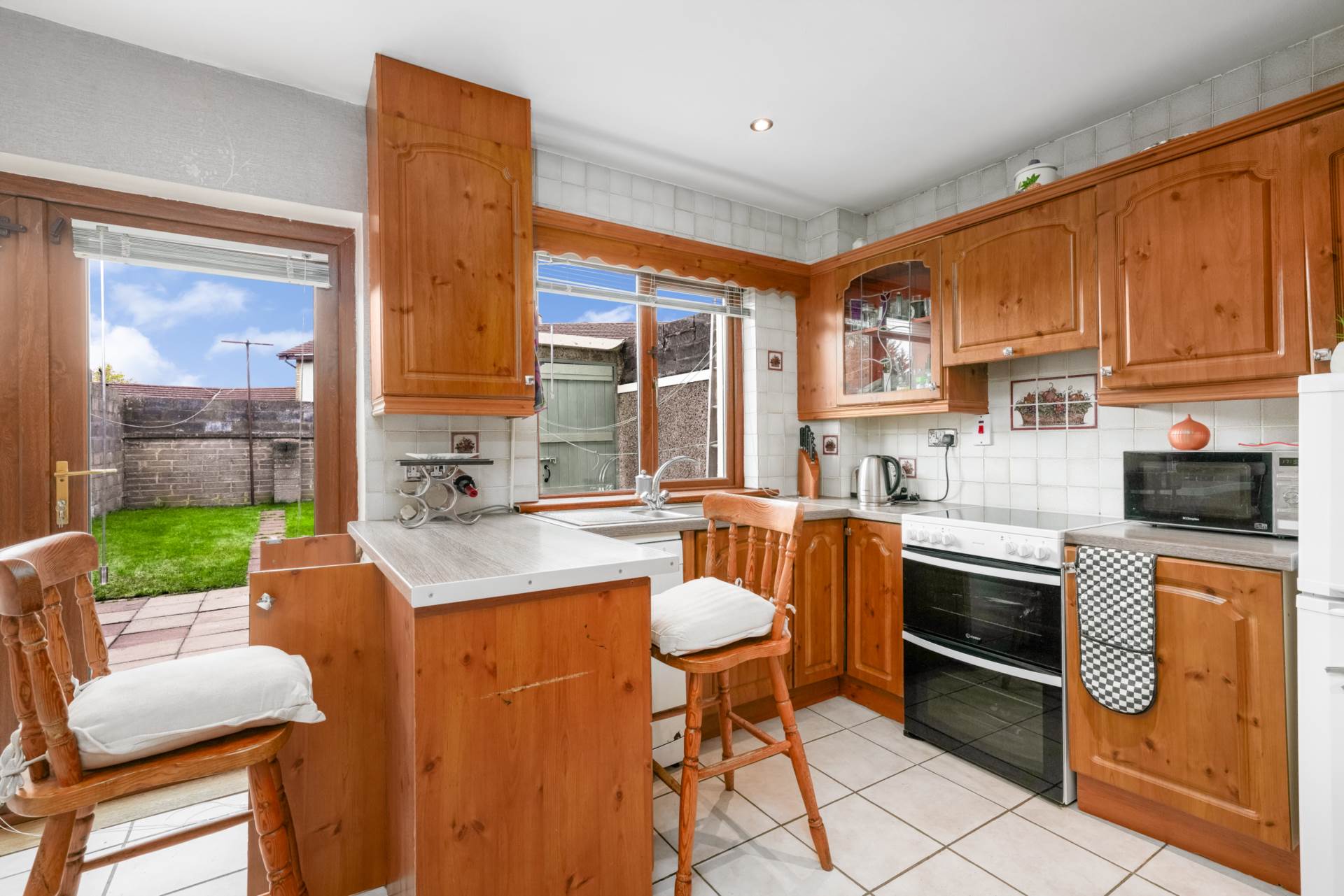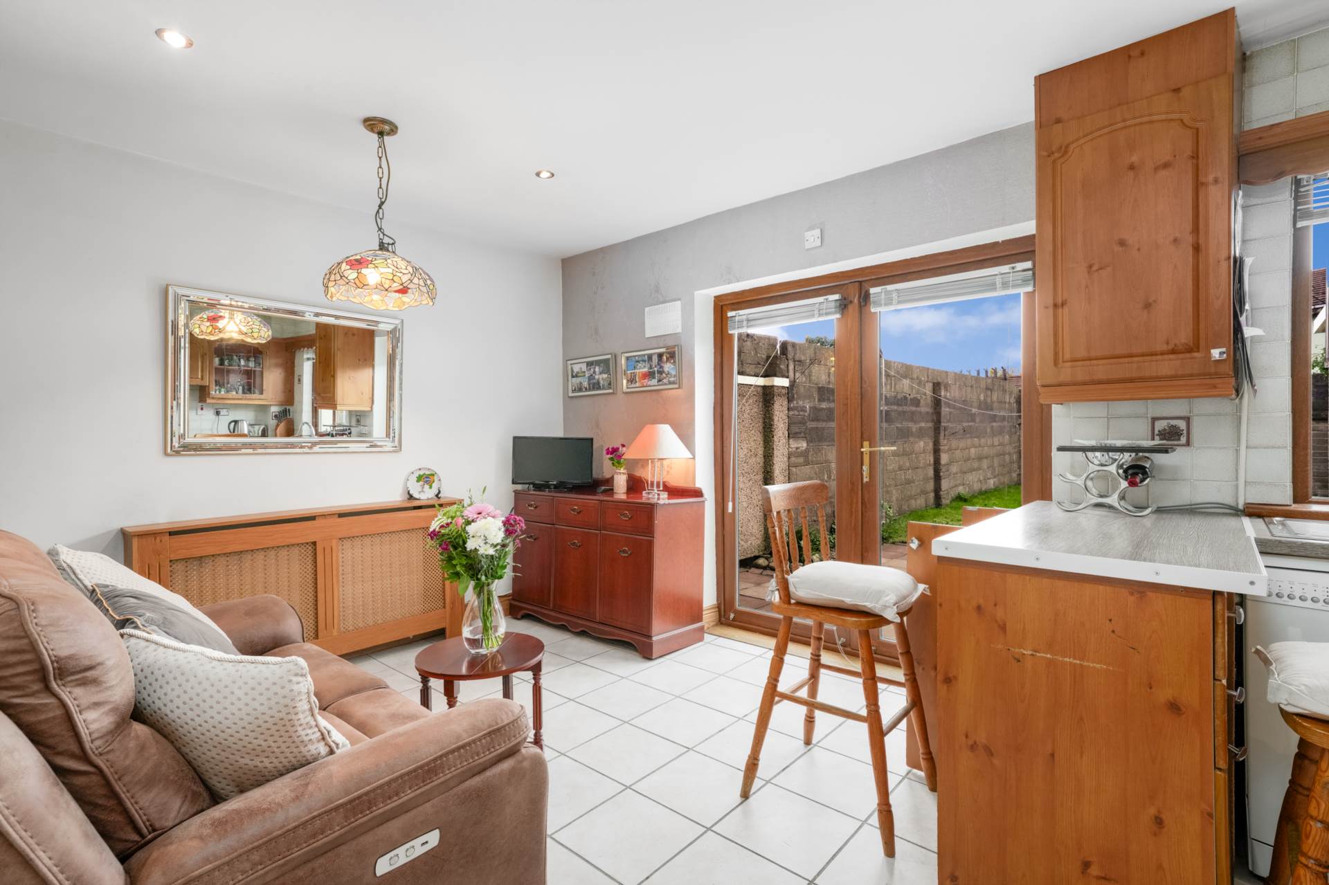 Lovely bright space with a kitchen window and French doors opening to the back garden. Tiled flooring. Fully equipped kitchen with breakfast bar. Covered radiator. Tiled splashback. Wall mounted boiler for GFCH. Recessed lighting.