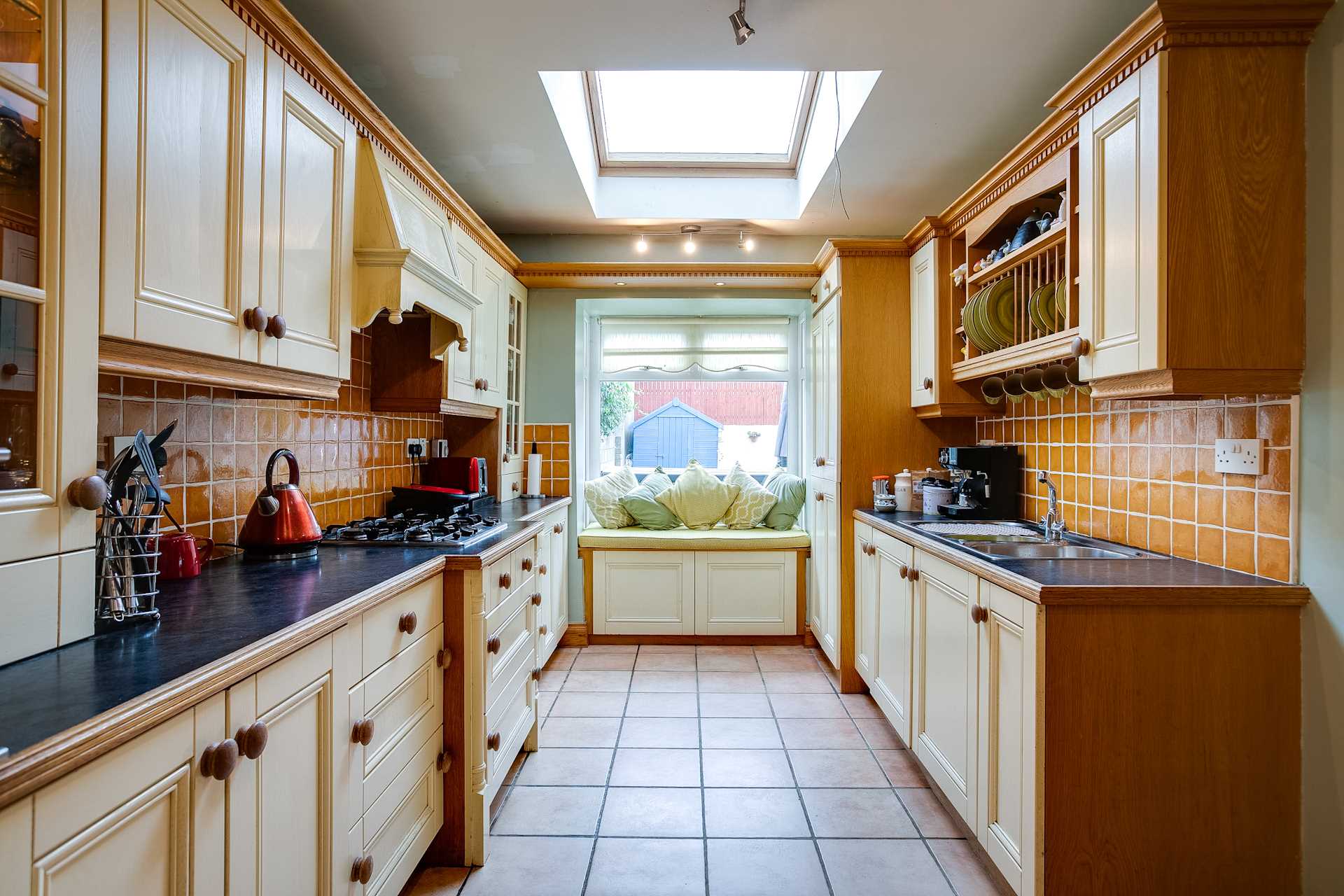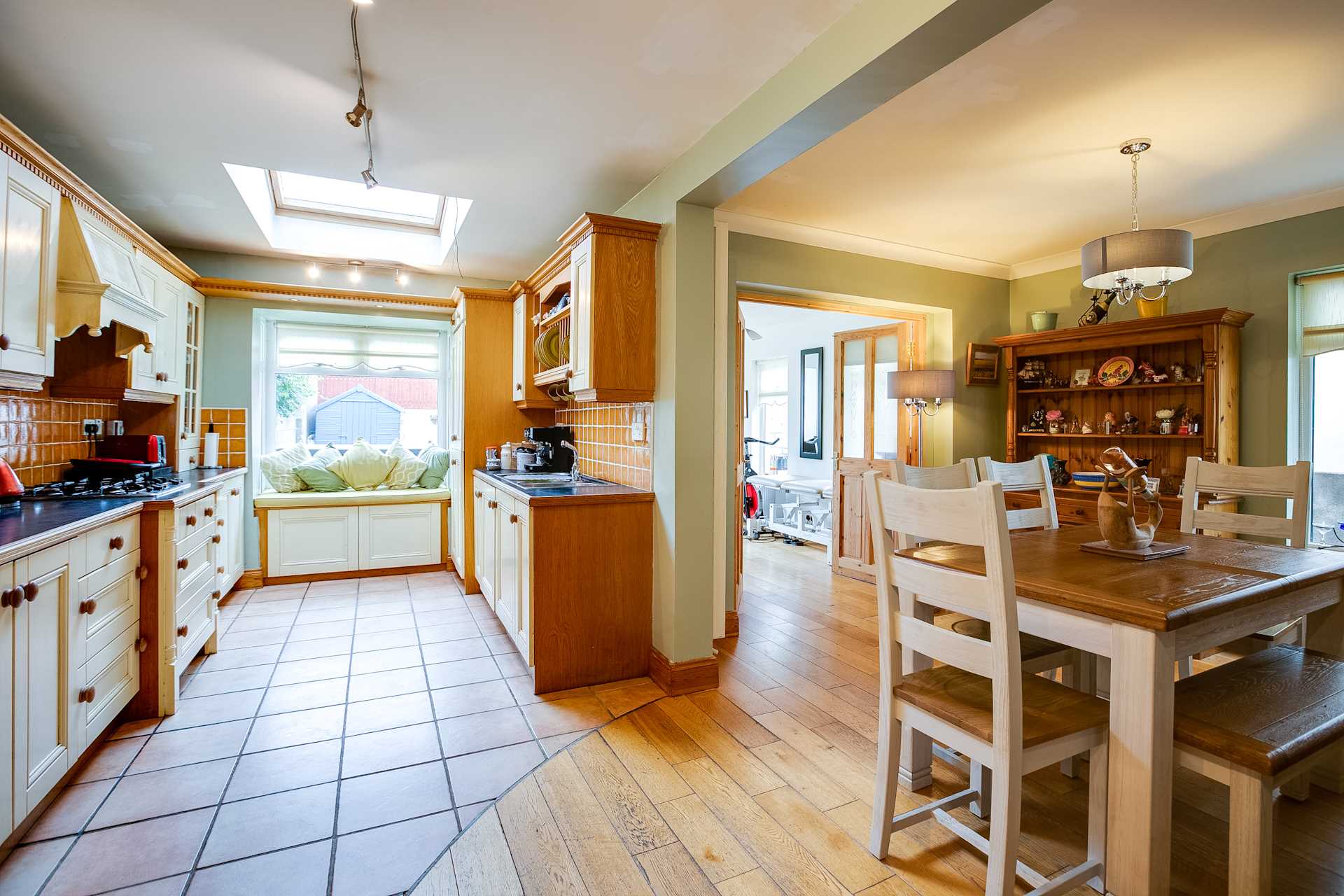 bay window with window seat. Large skylight. Equipped with fridge/freezer, oven, hob, hood. Plumbed for dishwasher and washing machine. Lots of storage presses including larder unit, saucepan drawers and a display cabinet. Tiled floor. Open-plan with dining room.