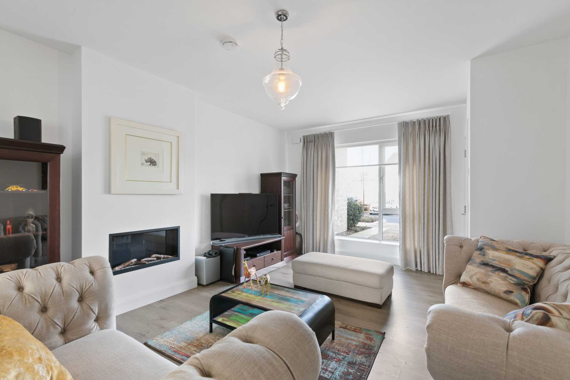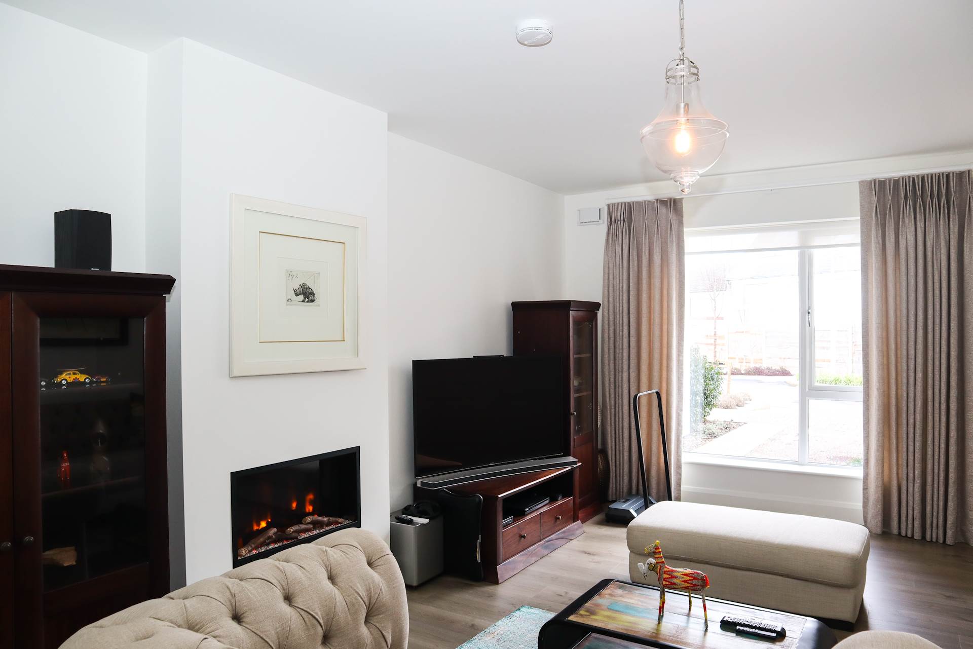 Feature wall-mounted fireplace providing a warm focal point. Large window to front. Curtains, curtain rod and bllinds. Wood flooring.