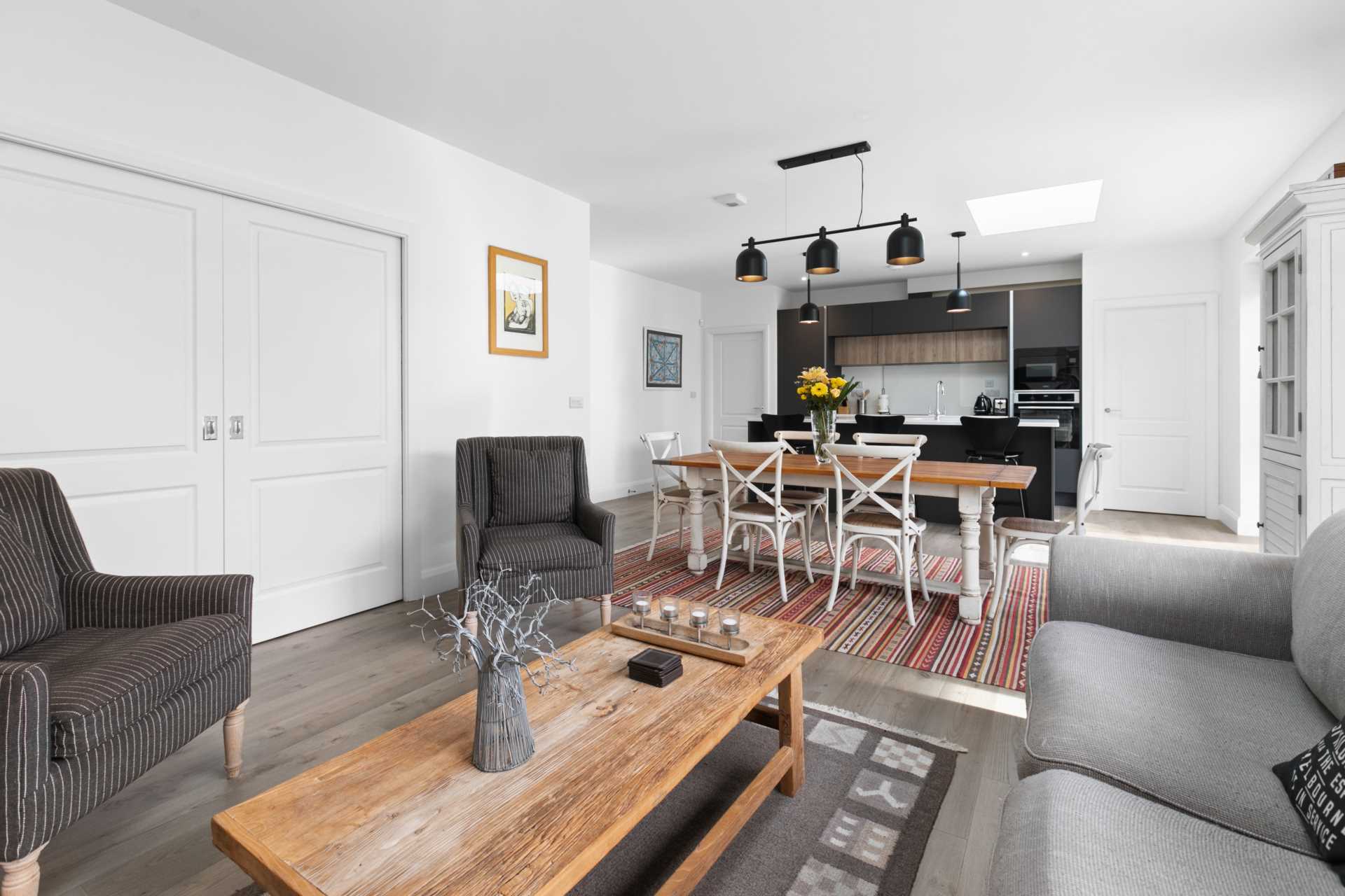 Highlights of this accommodation include an exceptionally large and bright main living space at the heart of this home, with south facing windows and skylights. This is connected by double doors to a separate front living room. Across the hall from this there is a downstairs study, guest WC and an extra large storage room extending under the stairs. Upstairs are four double bedrooms with a master ensuite and a family bathroom. All bathrooms are exceptionally well appointed.