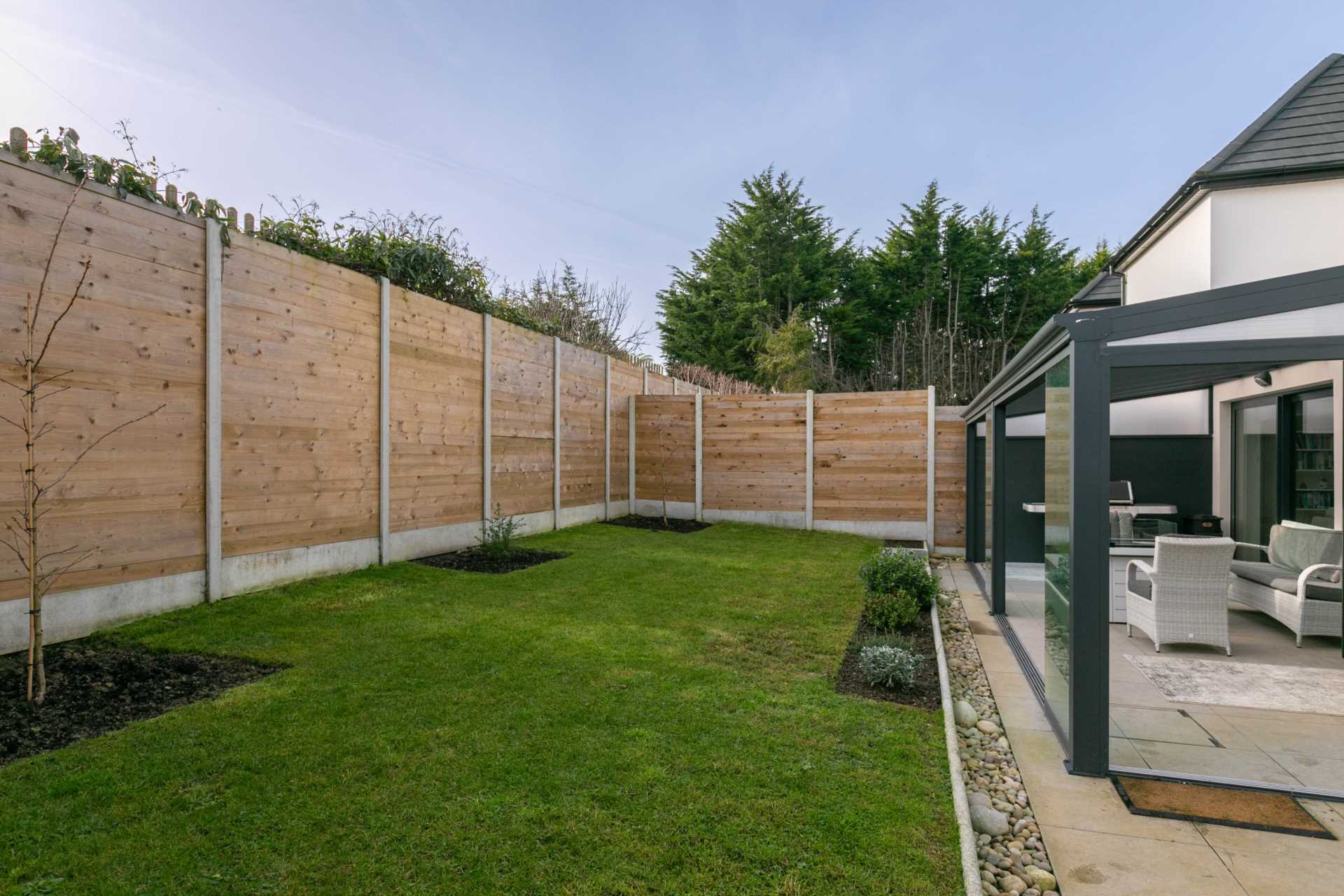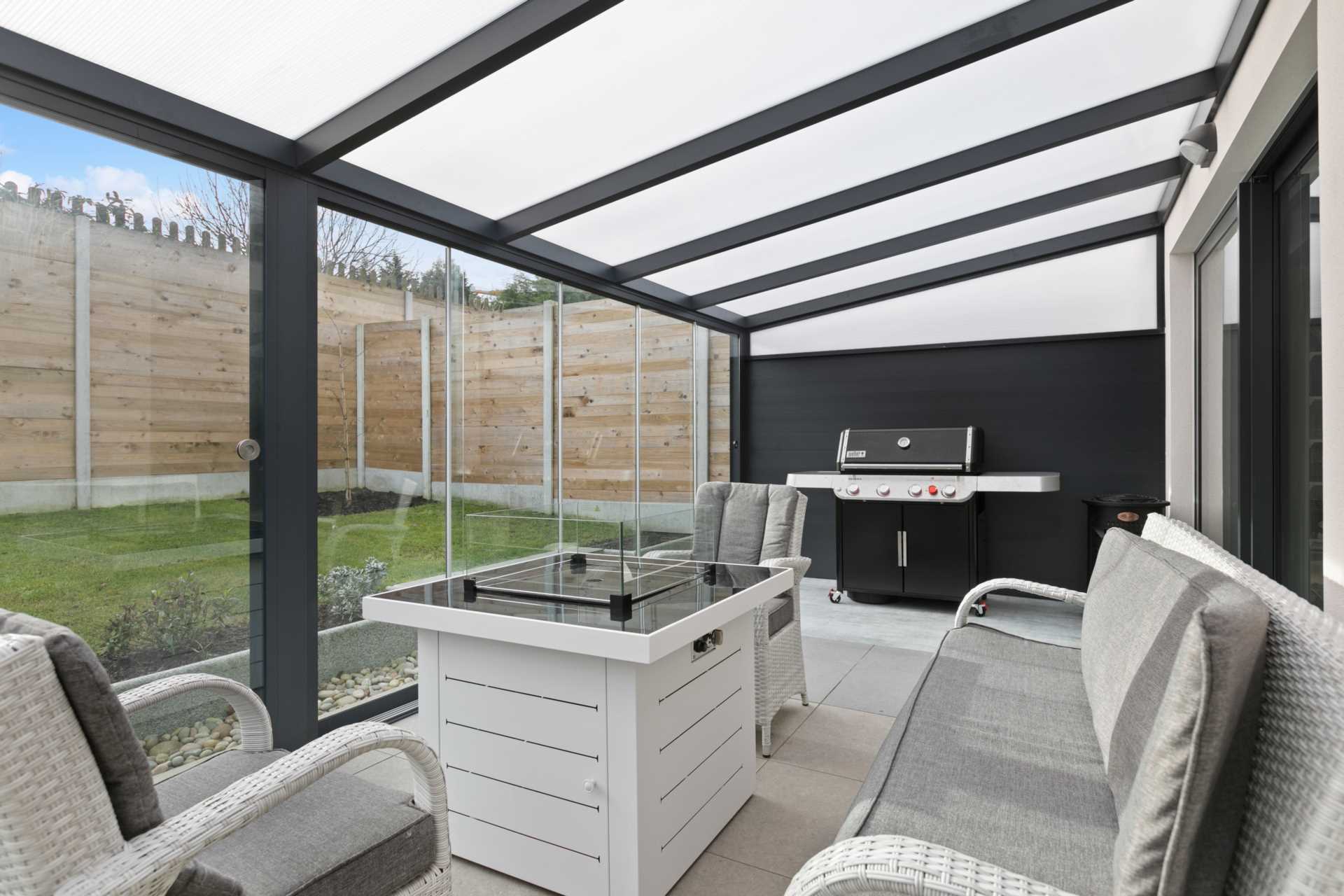 Enjoying the outdoors throughout the year with indoor-style comfort, providing an extra 24sq.m. of living space. Granite paved flooring.High quality glass sliding doors, Perspex roof. (Yardbox can also provide louvered or folding roofs). Fire box, barbecue and hammock chair are not included.