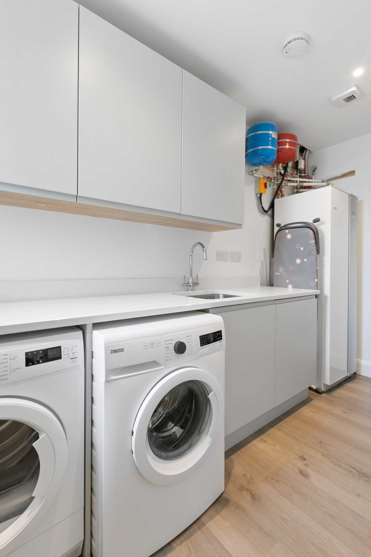 Washing machine. Separate dryer. Sink. White stone counter top. Wall-mounted presses. Control unit for climate control system. Fuse box. Wood flooring.