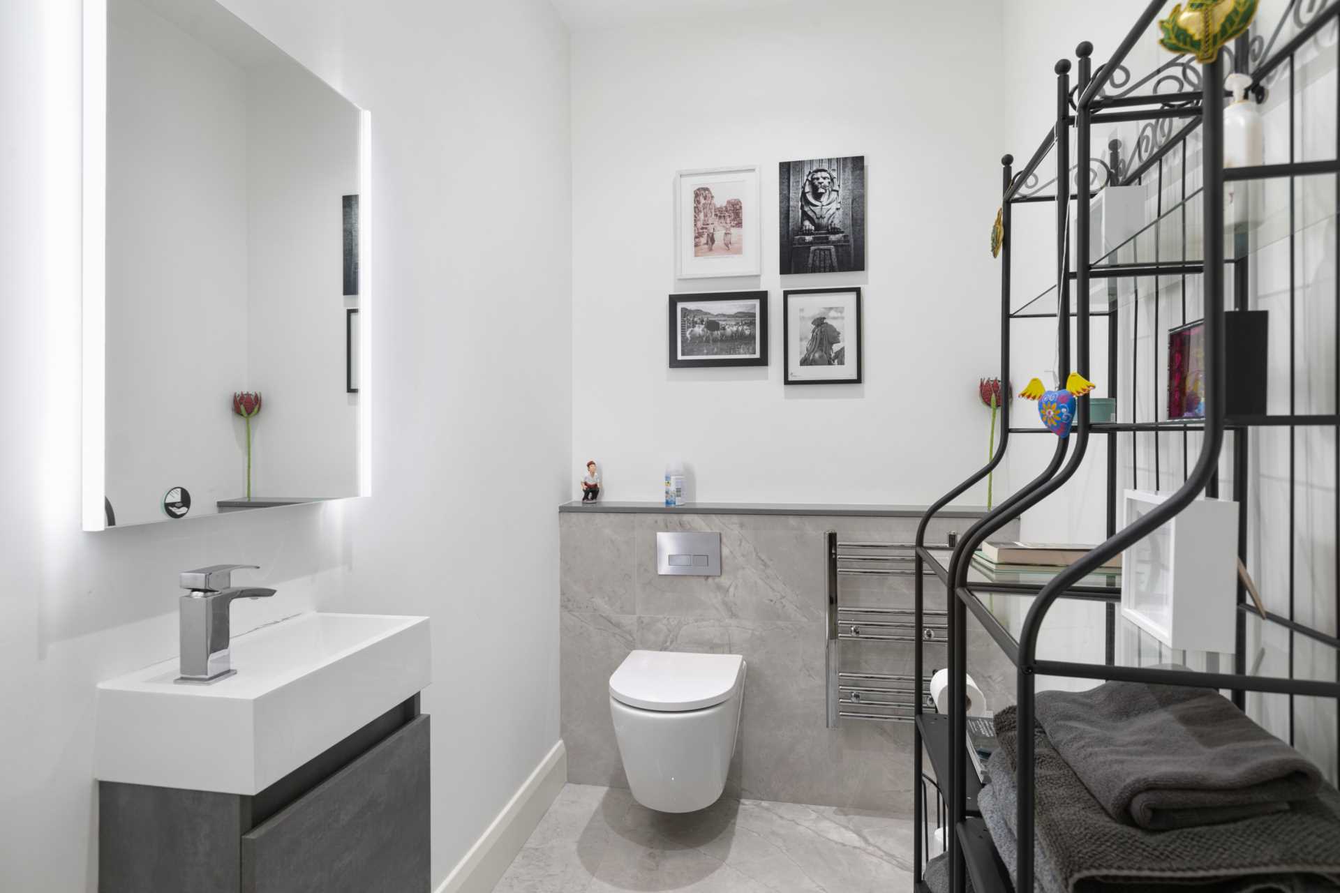 Tiled floor and part tiled walls. WC with hidden cistern. Heated towel rail. Lit vanity mirror.High quality sanitary fittings. Recessed lighting.