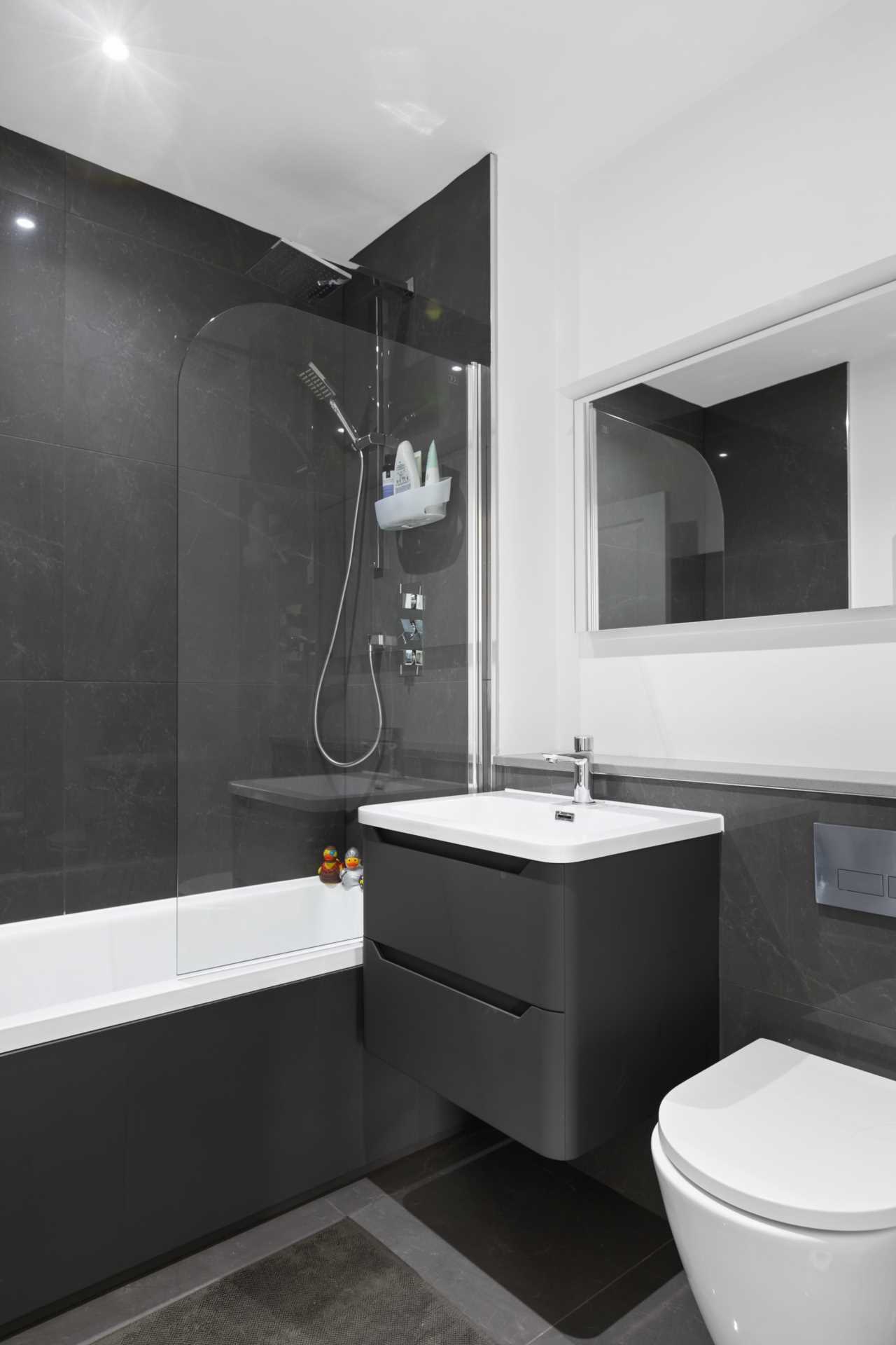 Tiled floor and part tiled walls. WC with hidden cistern. Heated towel rail. Vanity shelf under a lit vanity mirror.Floating WHB with two storage drawers. Full sized bathtub with glass shower screen and high pressure rainfall shower. High quality sanitary fittings. Recessed lighting.