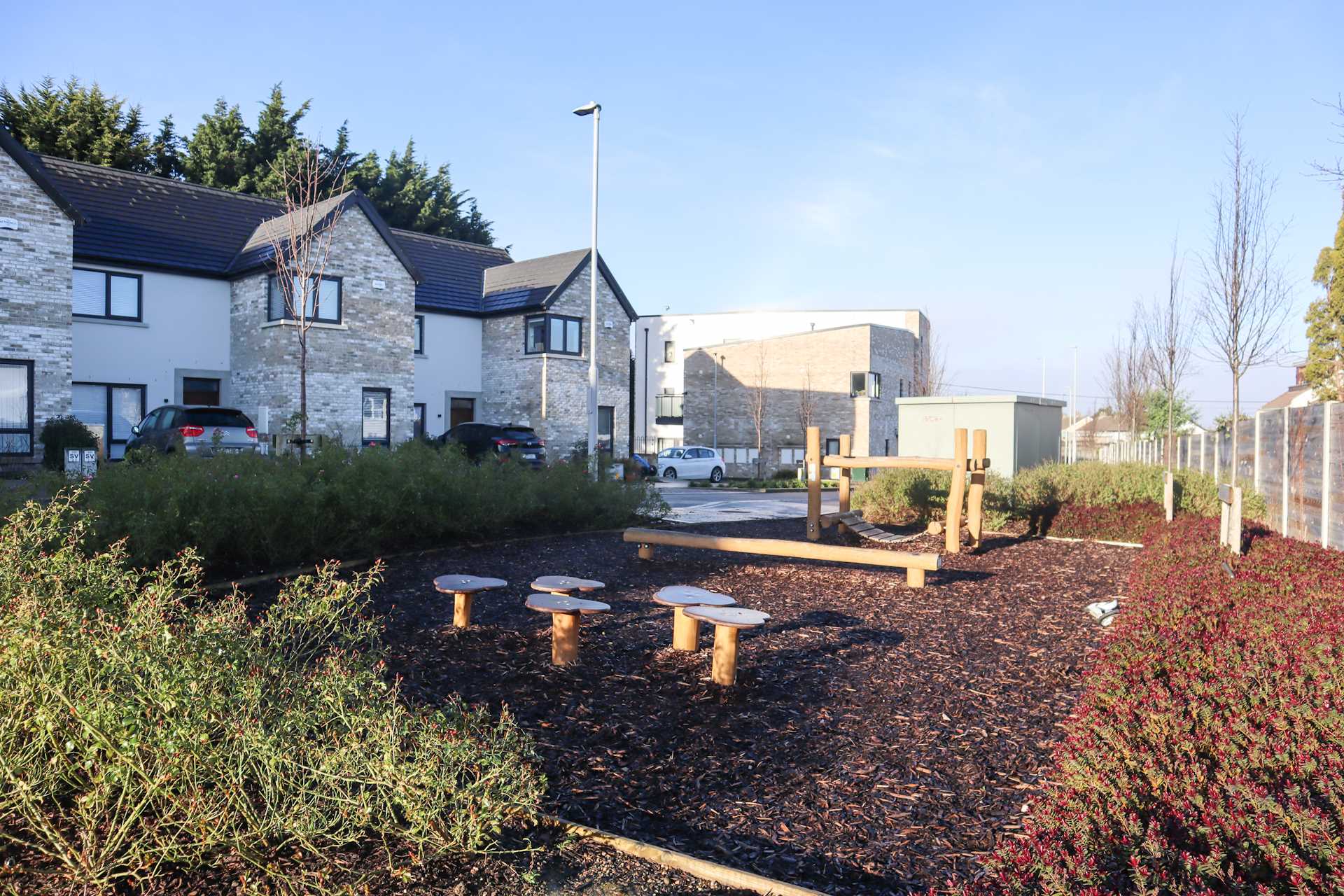 Cobble-locked, off-street parking for two cars. Shrubs. Facing a playground. Additional on-street parking available.
