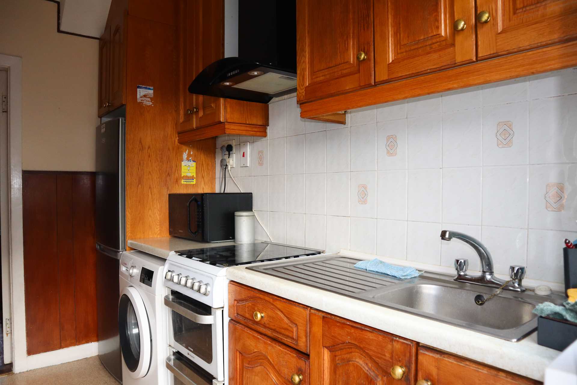 Glazed door to back garden. Lino over pine floorboards. gas cooker with Belling hood. Belling fridge/freezer. Washing machine. Stainless steel sink with draining board.