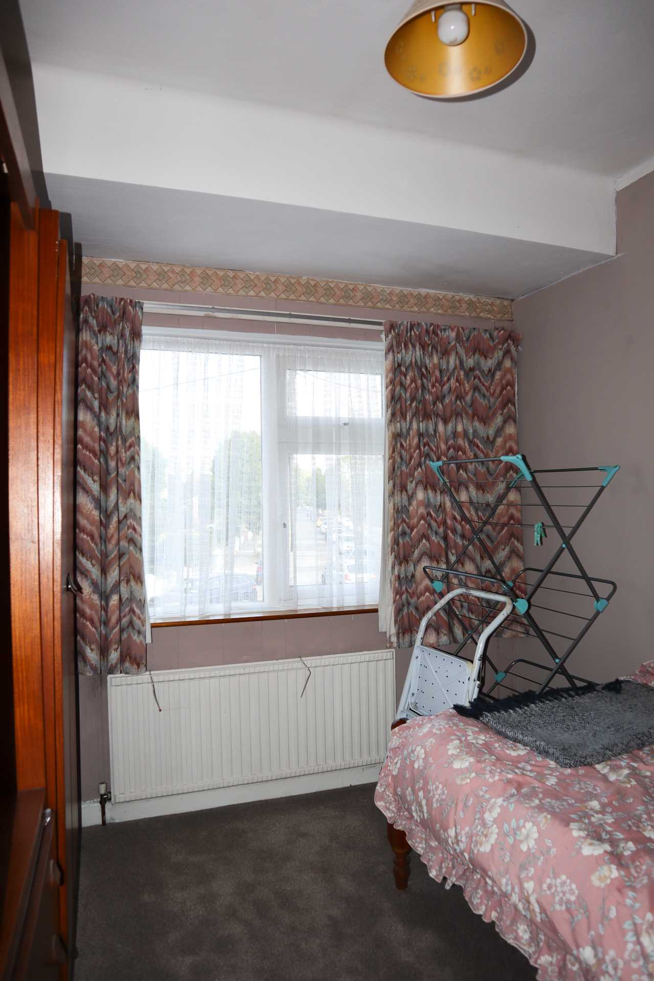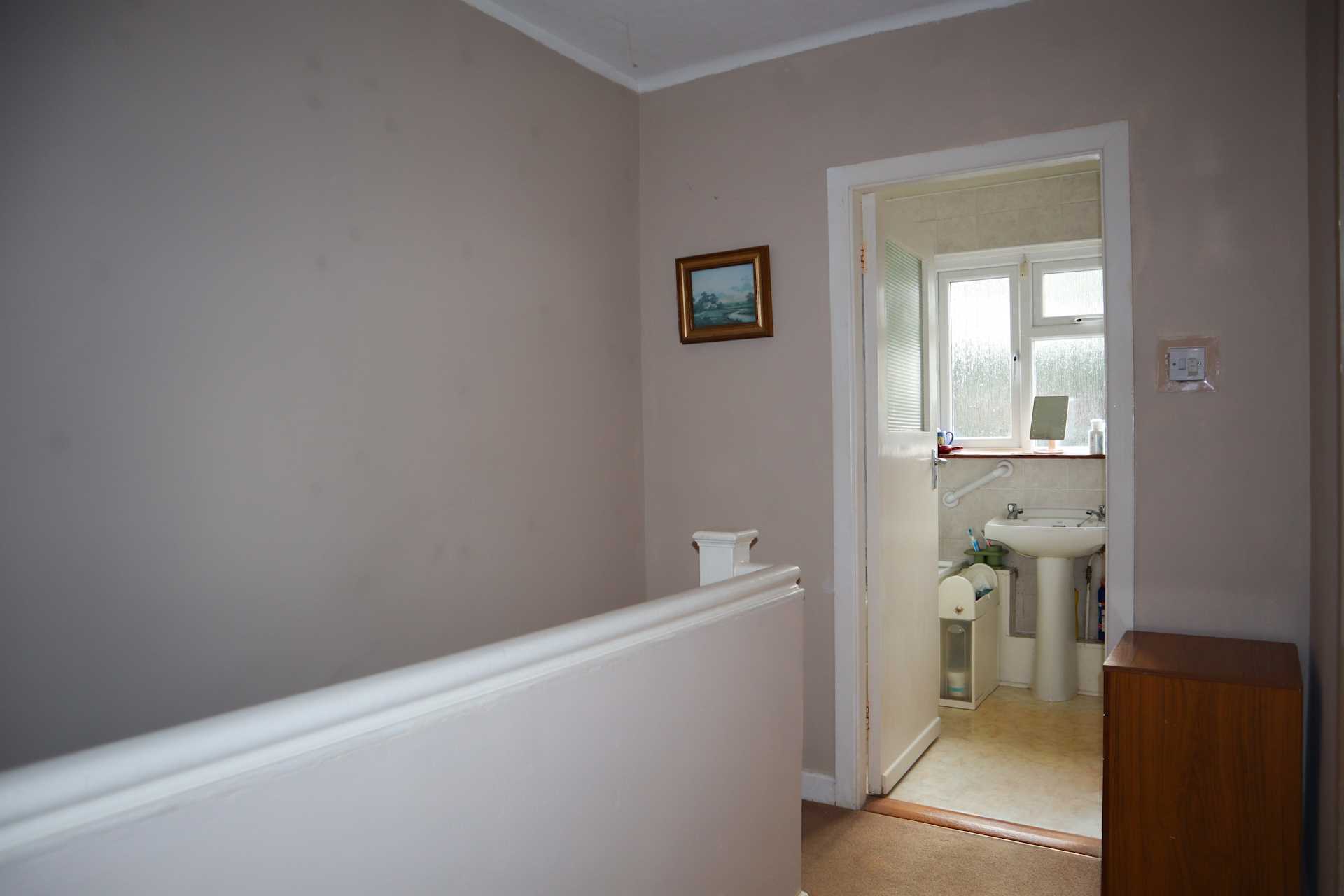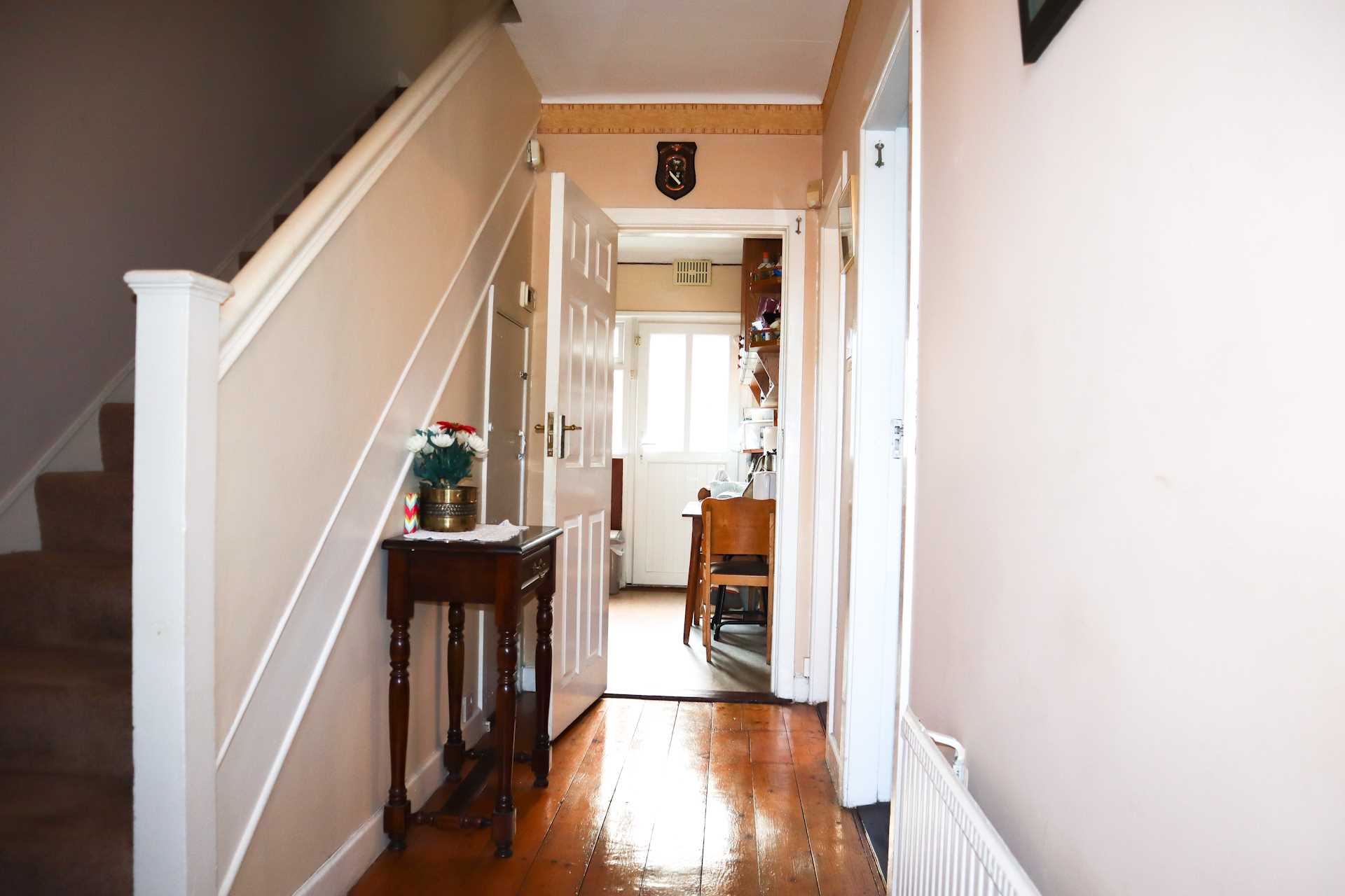 The generous front garden has well tended shrubs and off-street parking for 3-4 cars. The side entrance narrows from 5ft wide at the front to 2ft 6" wide at the back.