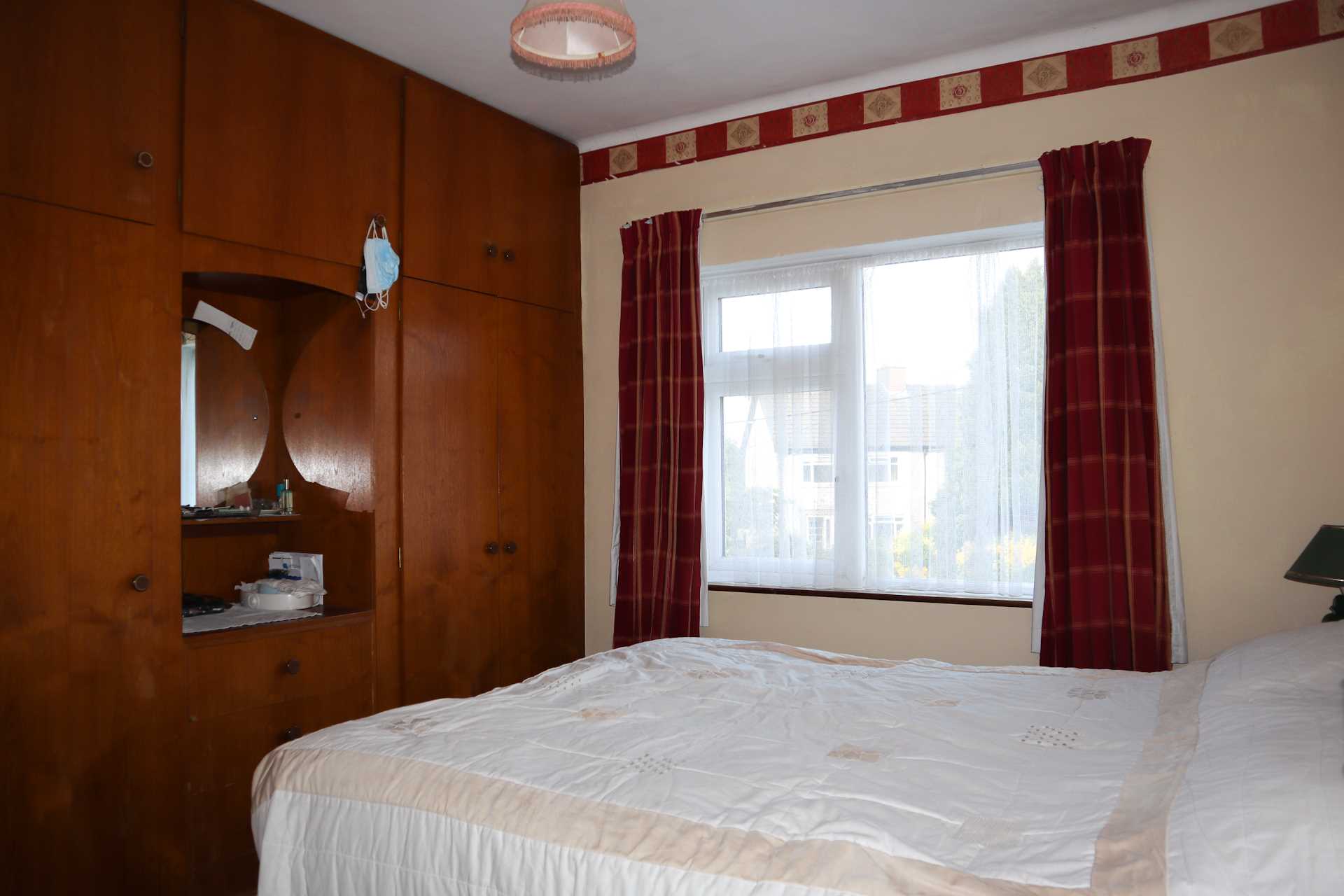 Carpet over pine floorboards. Fitted wardrobes. Curtains. Window to front.