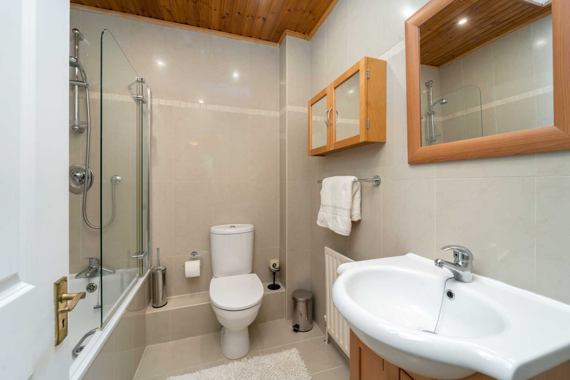 Fully tilled. Bath with shower screen. WC, WHB