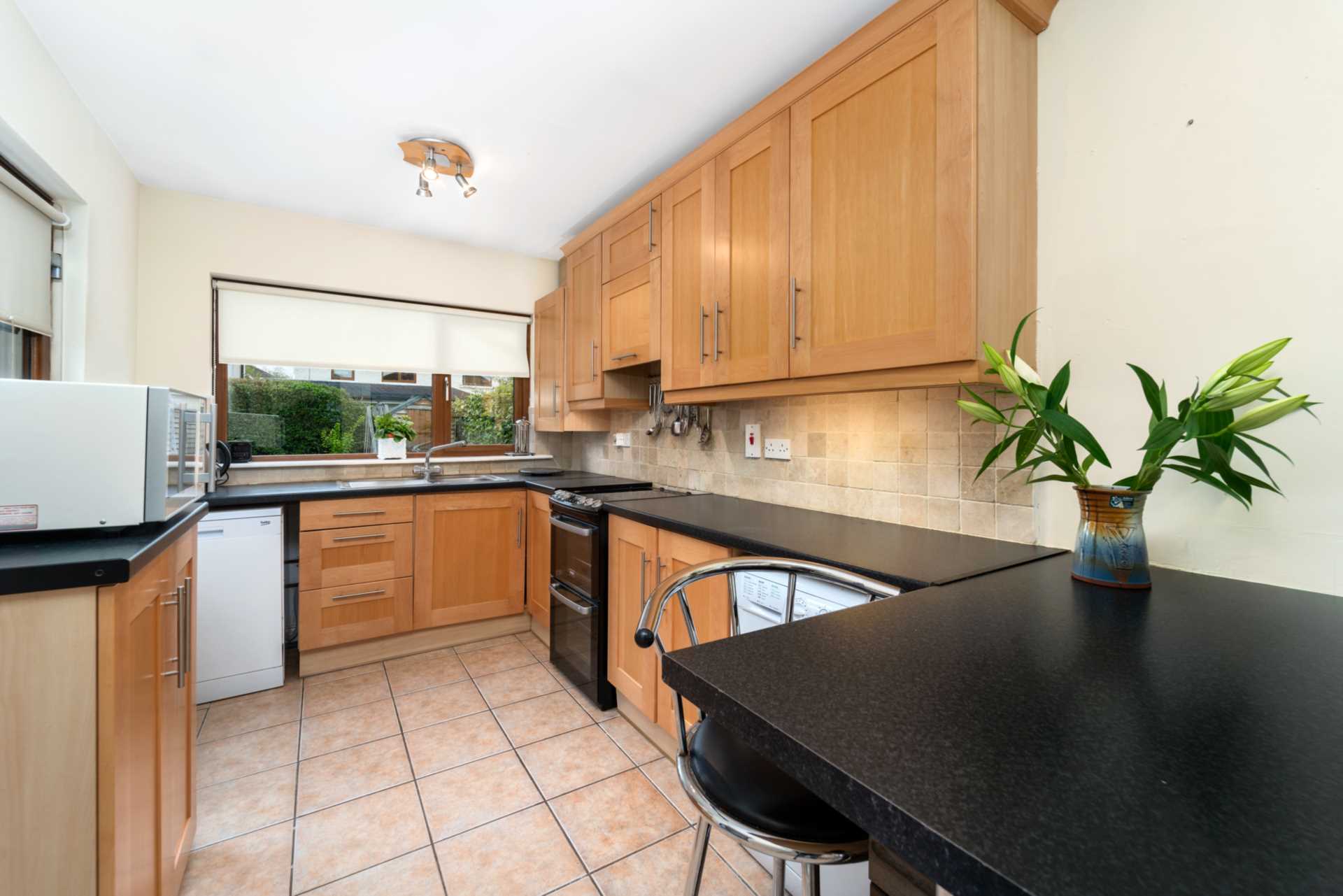 Tiled, fully fitted kitchen with breakfast counter over looking rear back garden.