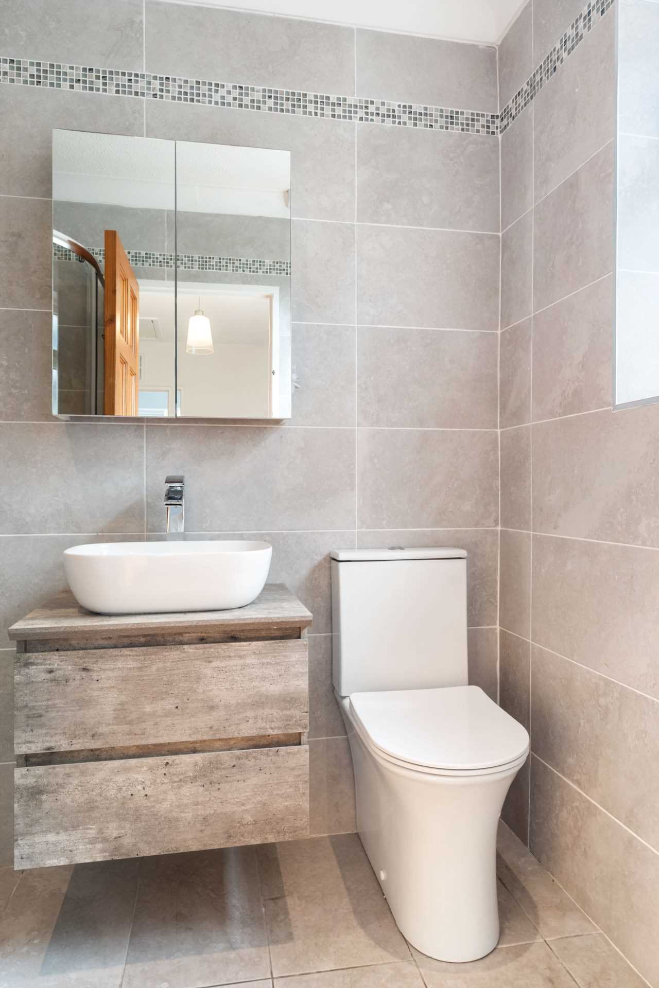 Modern bathroom with frosted glass window. Fully tiled with attractive mosaic elements. Glass shower cubicle with Triton electric shower. Heated towel rail. Recessed lighting.Oval high grade WHB with cabinet under and mirrored medicine cabinet over. WC with slimline cistern.