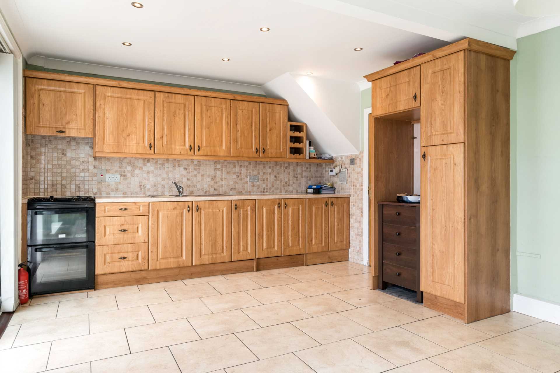 Spacious room extending the full width of the house. Large window to rear plus glazed sliding doors to the conservatory flood this space with excellent natural light. Fitted kitchen with cooker, hood, stainless steel sink with rinse bowl. Tiled flooring. recessed lighting. vertical blinds.