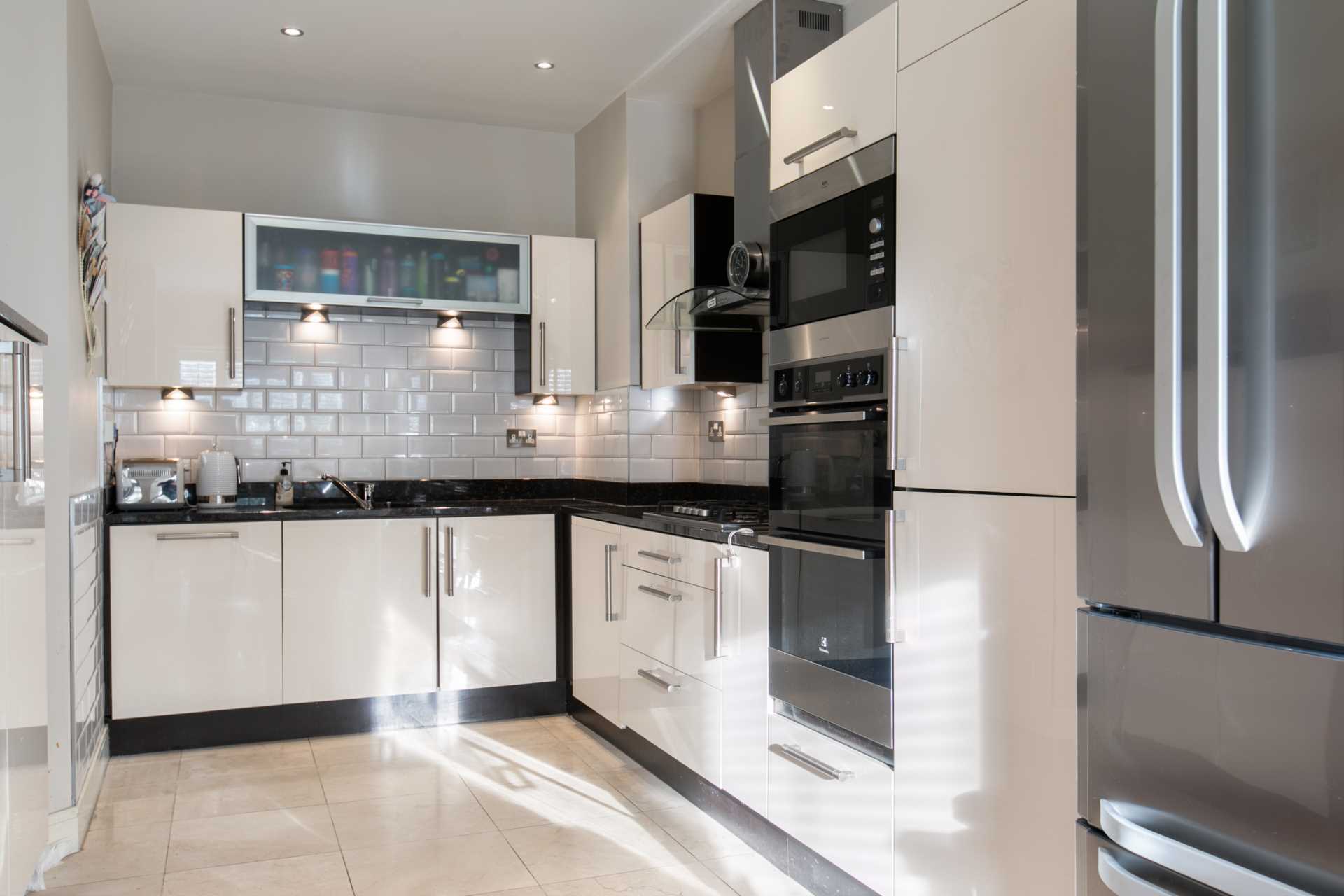 Range of integrated fitted units, marble flooring, granite worktop, 1 and ½ bowl sink unit, attractive white metro tile splashback, five ring gas hob, microwave oven, double oven, dishwasher, washing machine, radiator cover and recessed lighting. Space for a large fridge-freezer.