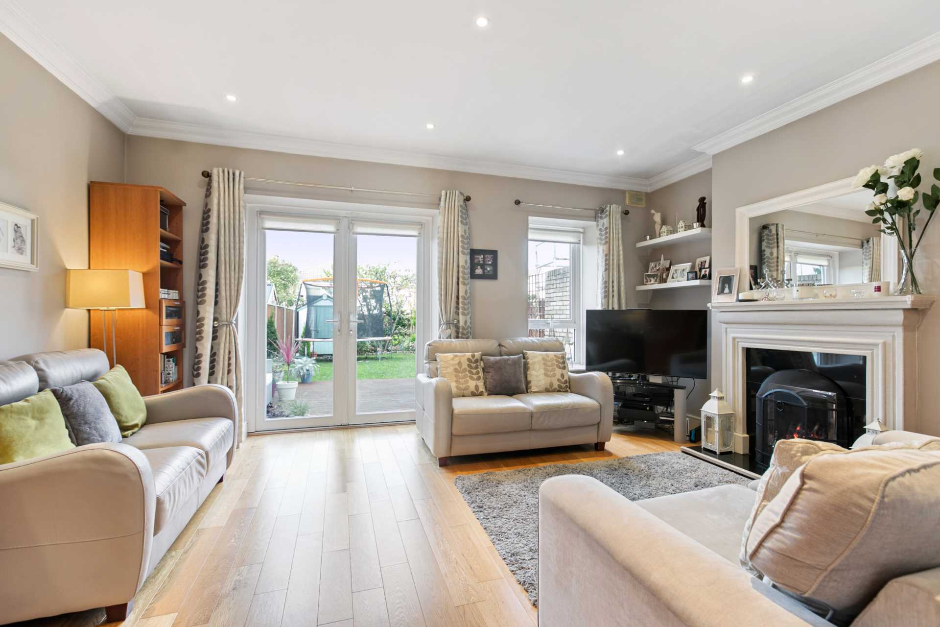 Fireplace with marble hearth and stone surround and fitted gas fire. TV and telephone point, recessed lighting, radiator cover, oak floor, double doors to rear garden (new window and doors fitted in 2022).