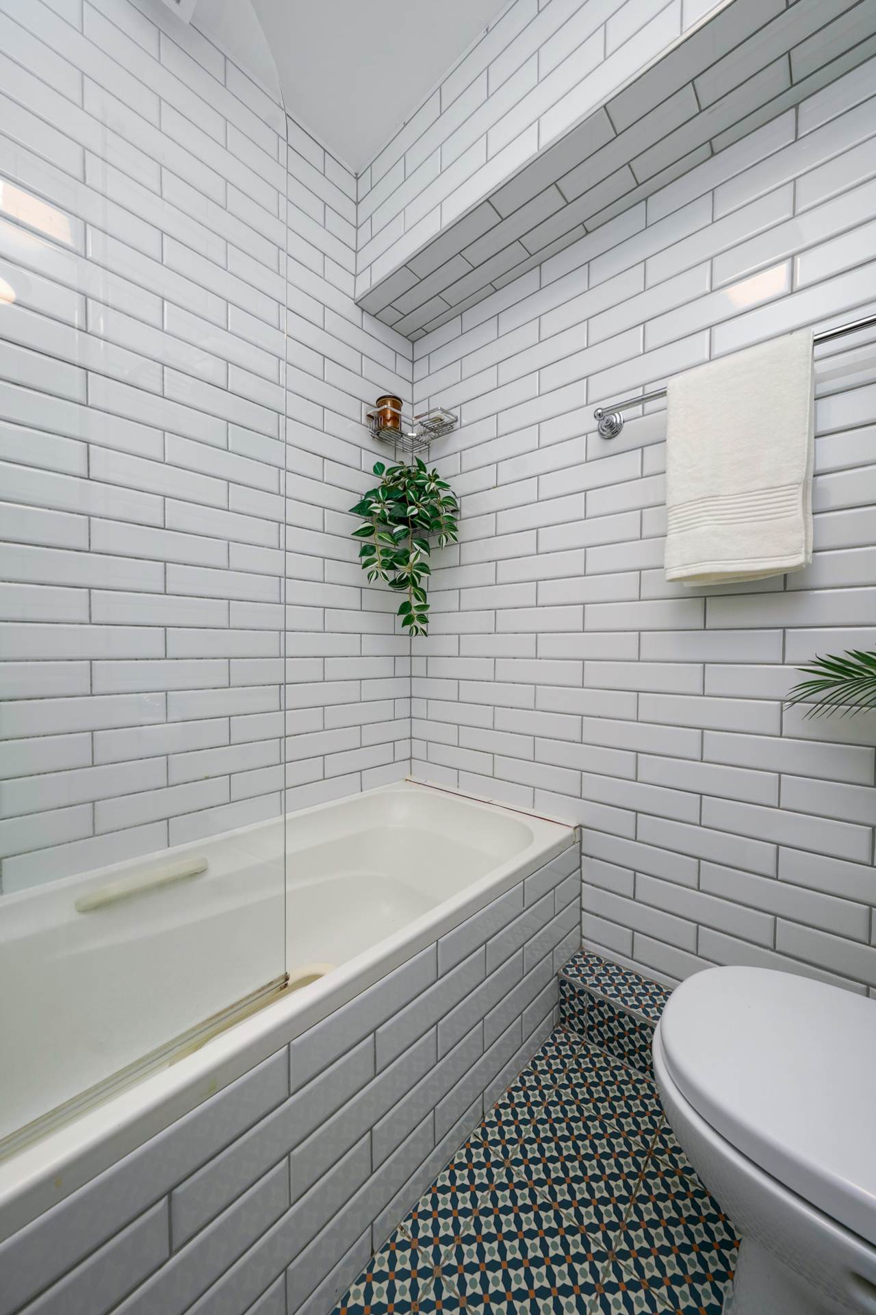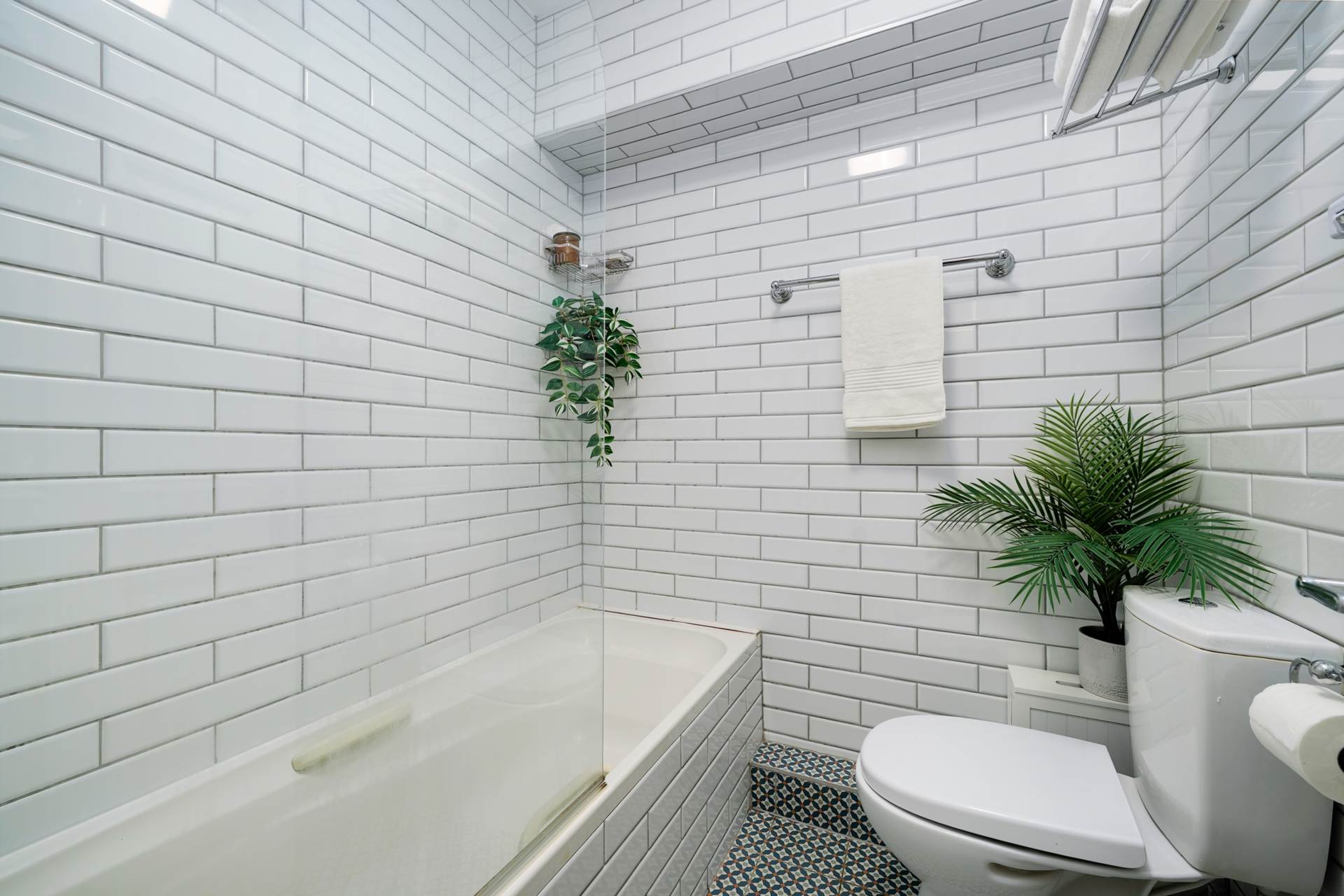 - Fully tiled bathroom with bath and overhead shower