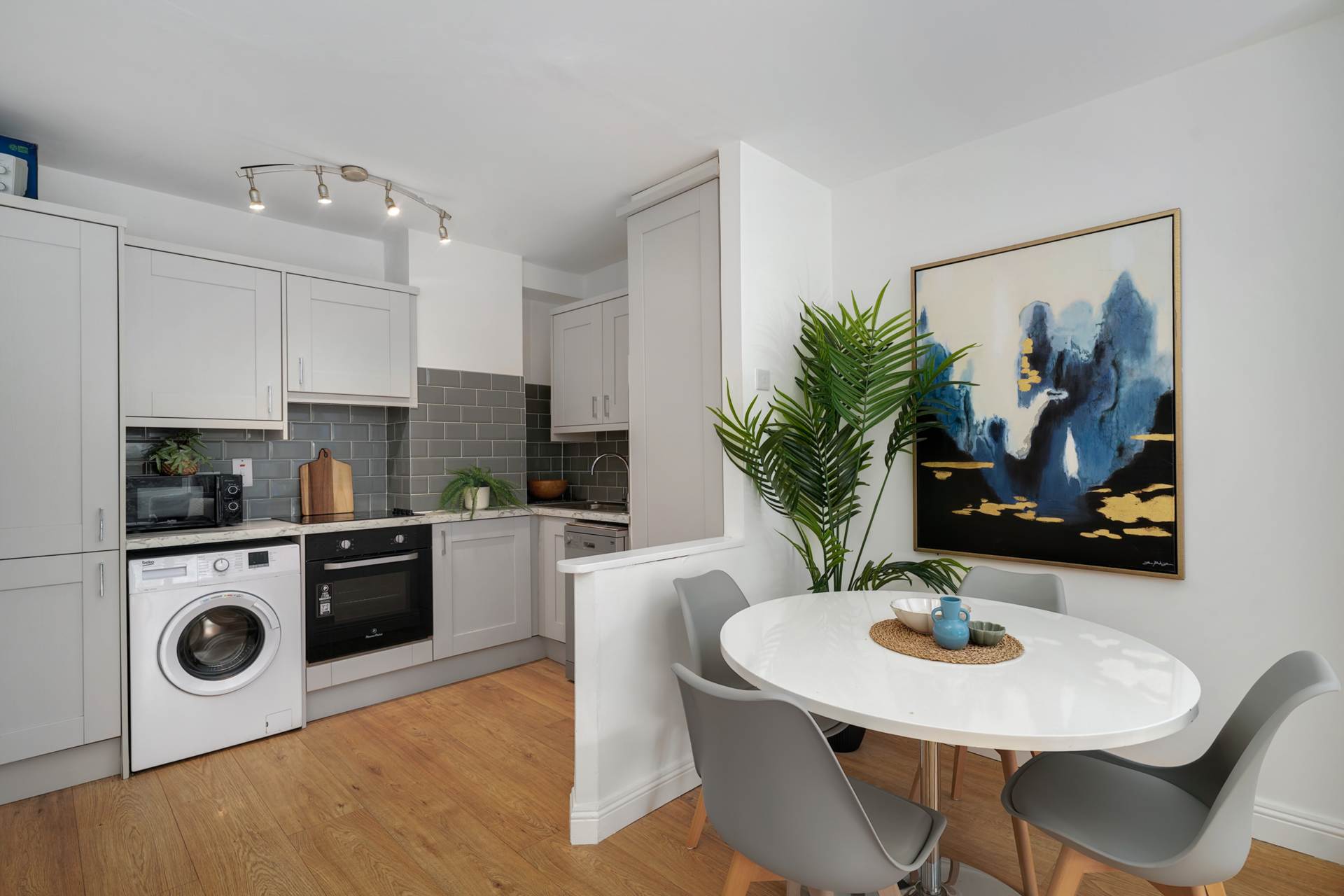 The apartment features an open-plan living, dining, and kitchen area, with large windows that allow natural light to flood the space, creating a warm and inviting atmosphere. The modern kitchen is fully equipped with an integrated oven, electric hob, dishwasher, washing machine, and a large fridge freezer.