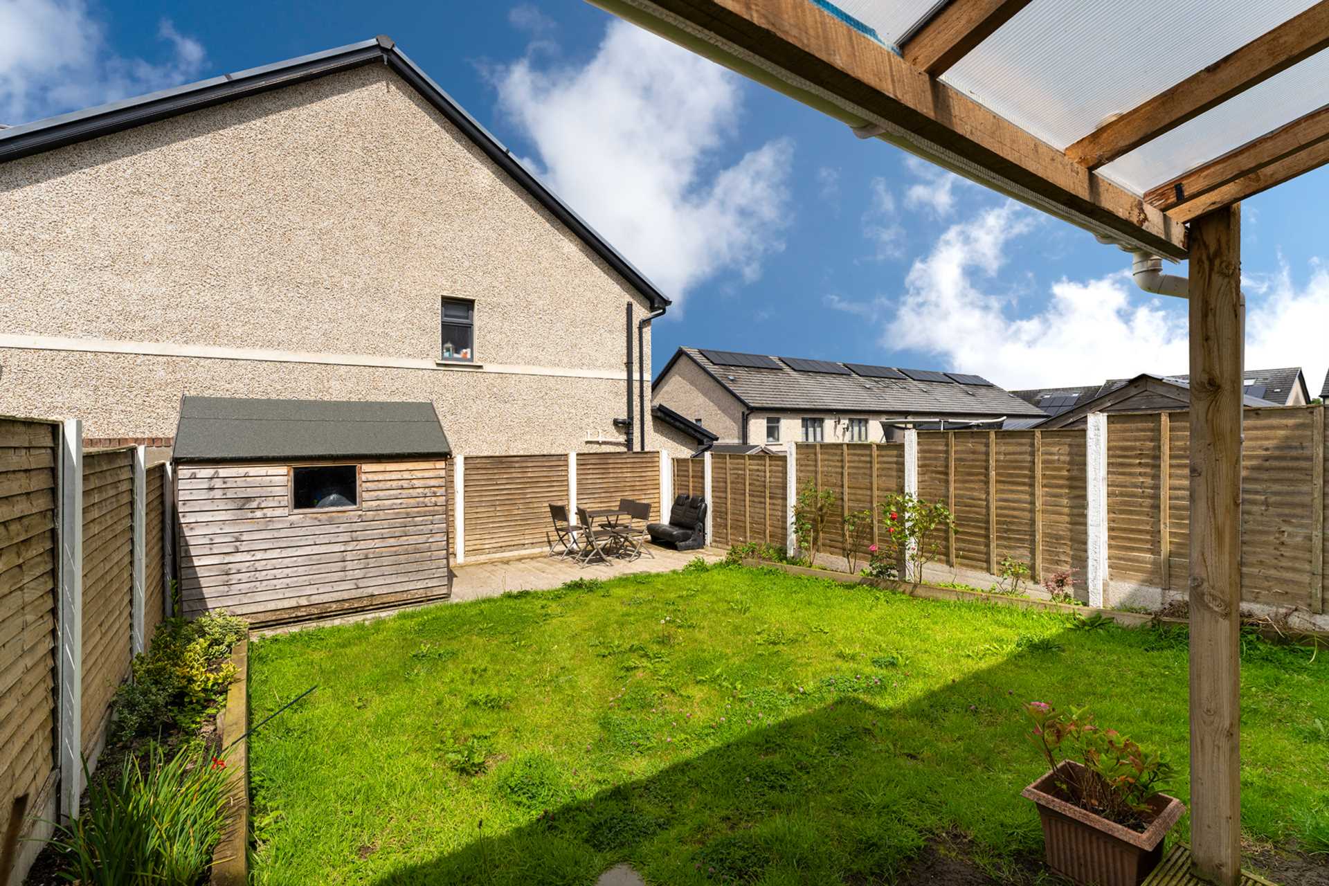 Garden shed. Concrete patio at foot of garden. Covered barbecue area. Back lawn.