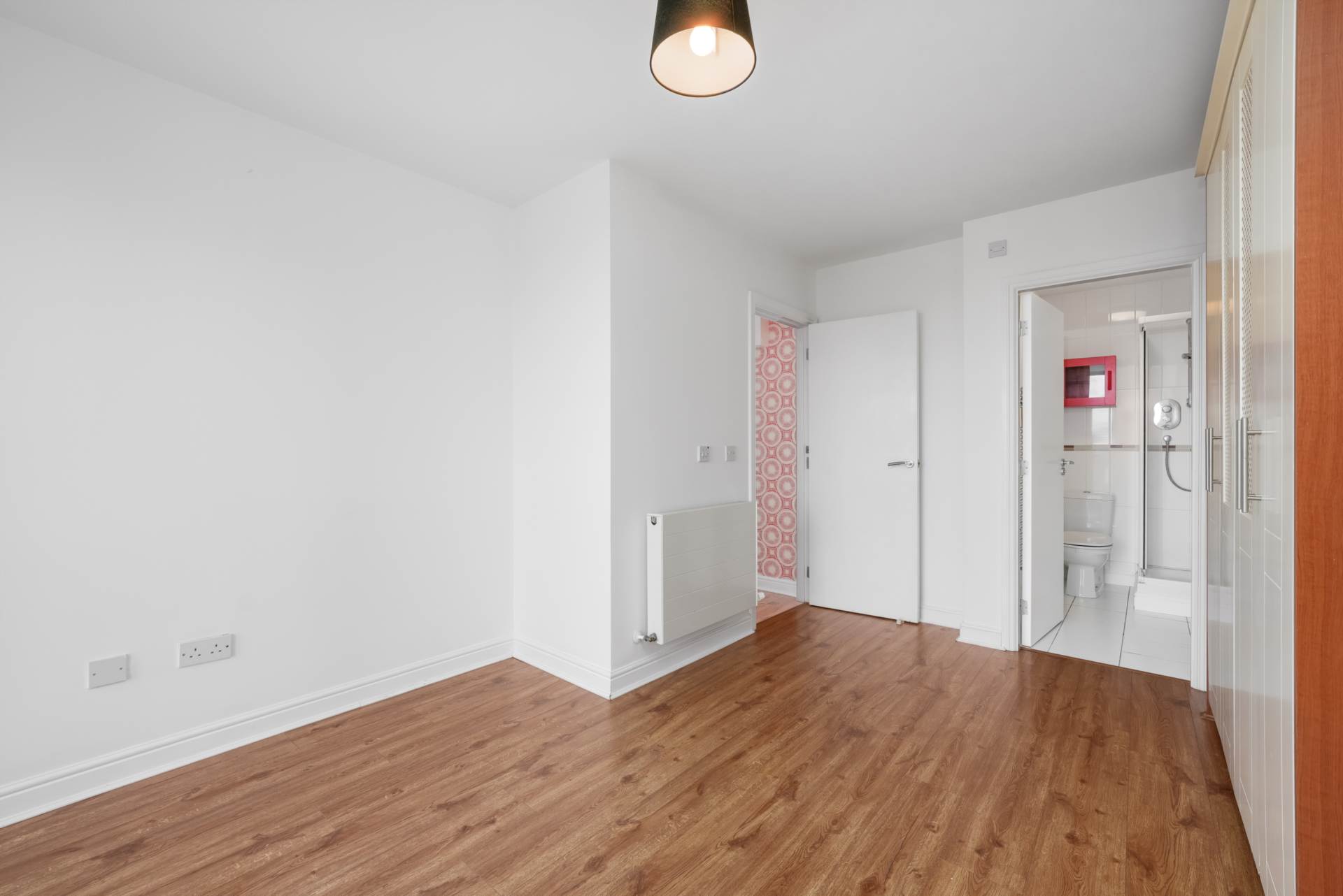 Spacious double bedroom. Large window and glazed door to balcony. Fitted wardrobes. Door to ensuite. Wood laminate flooring.