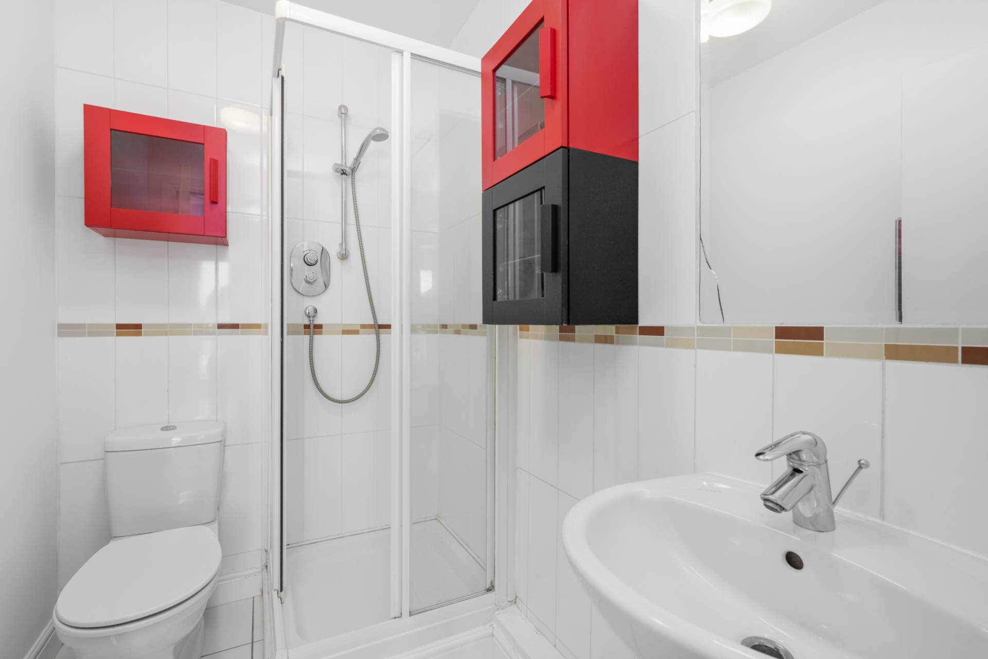 Fully tiled. Shower cubicle with glass door. WC. WHB. Heated towel rail. Wall-mounted cabinets. Mirror.