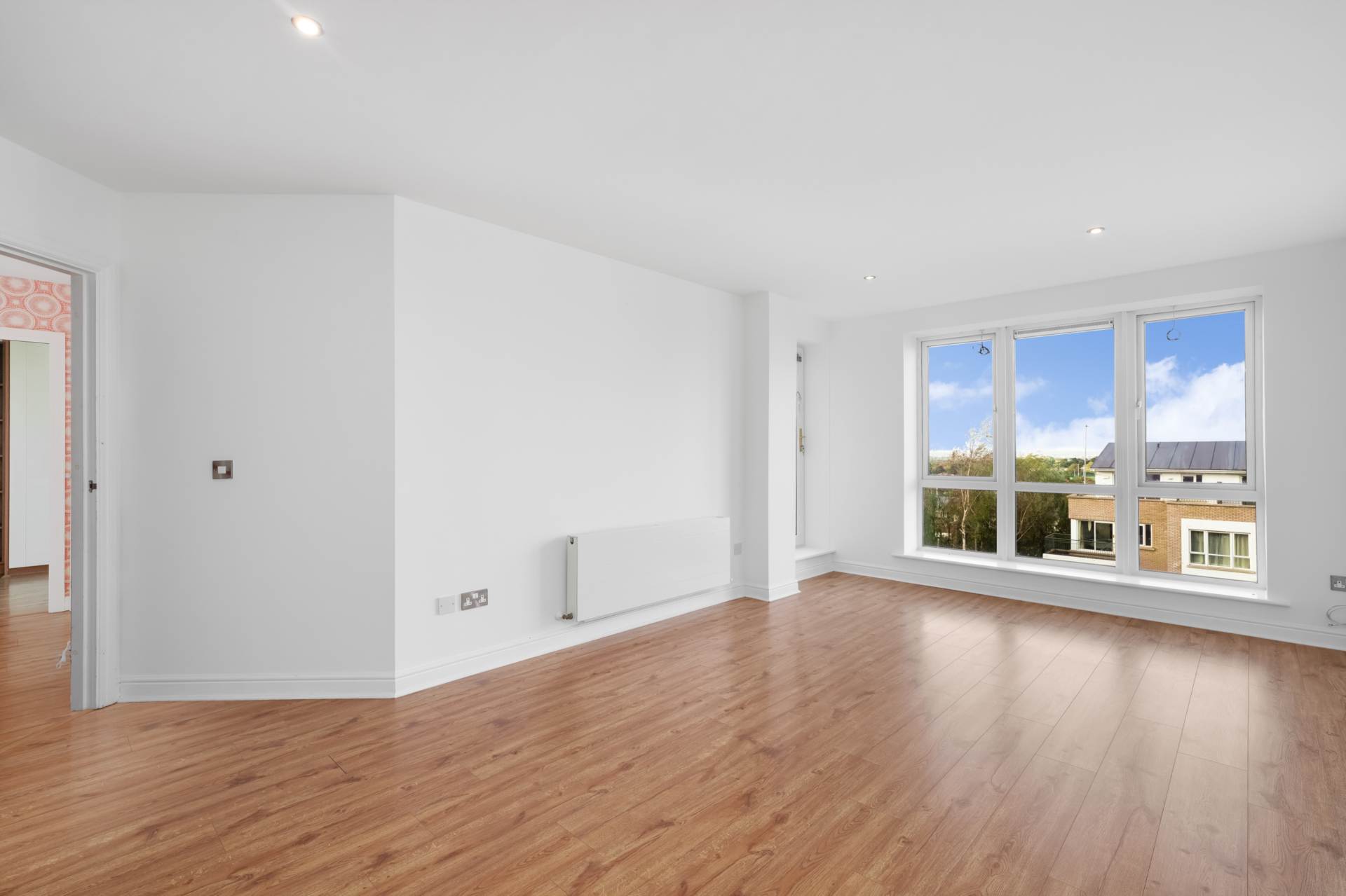Living area with a large window giving views over Dublin City. Combined with the glazed door to the balcony, this gives excellent natural light. TV/Broadband connection point.Recessed lighting. Wood laminate flooring.