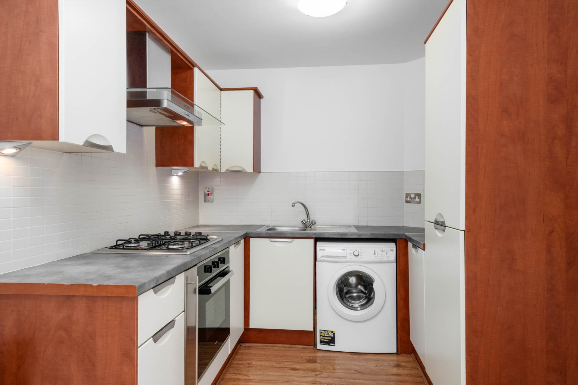 At the back of the main living room. Fitted cream kitchen with brushed aluminium handles, stainless steel sink and stainless steel hood. Fully equipped with washer/dryer, dishwasher, gas hob, electric oven and fridge-freezer. Glass fronted display cabinet. White subway tiled walls.Dedicated dining area beside the kitchen.