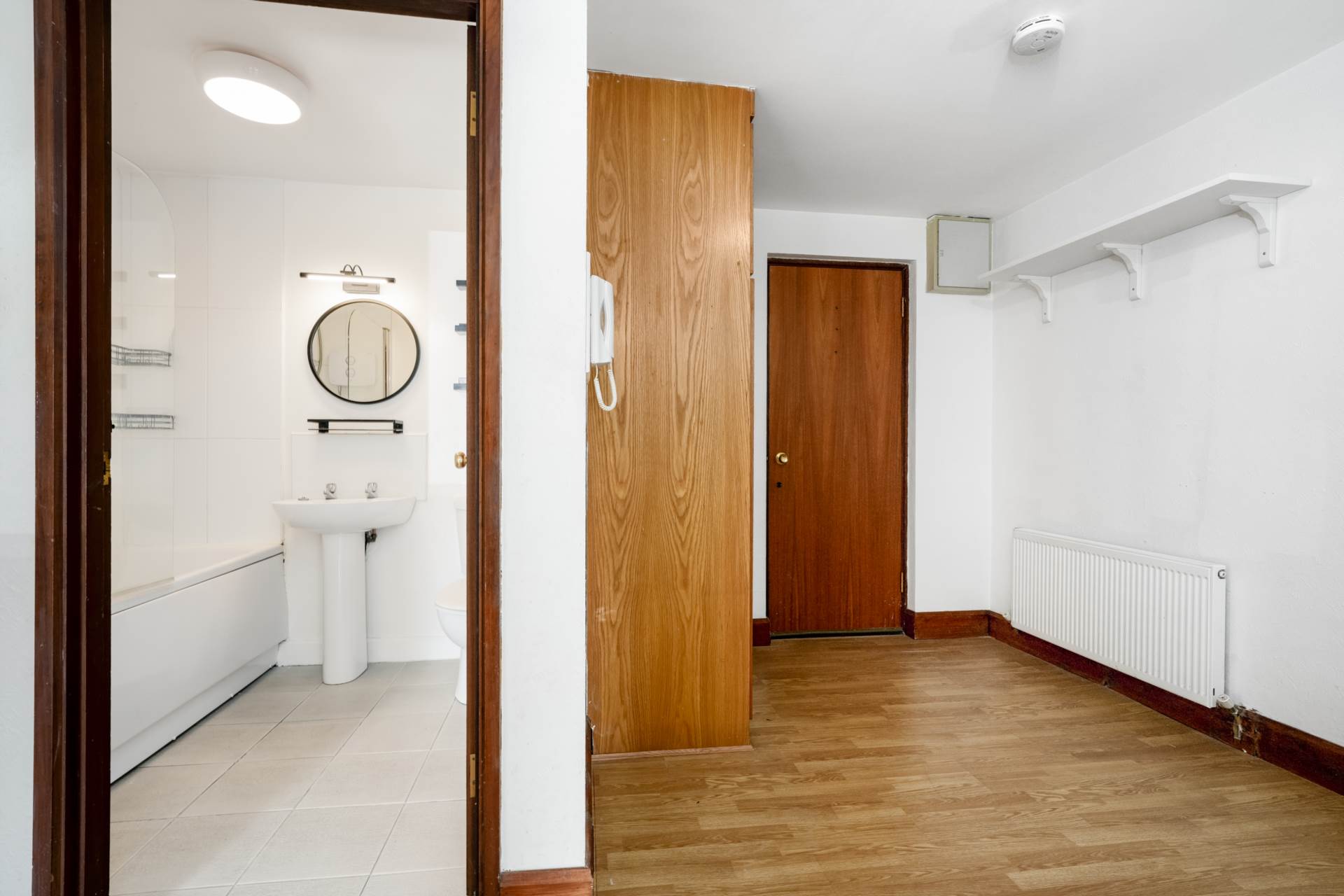 Spacious entrance L- Shaped hall with laminate wood flooring, audio intercom and hot press/storage closet.