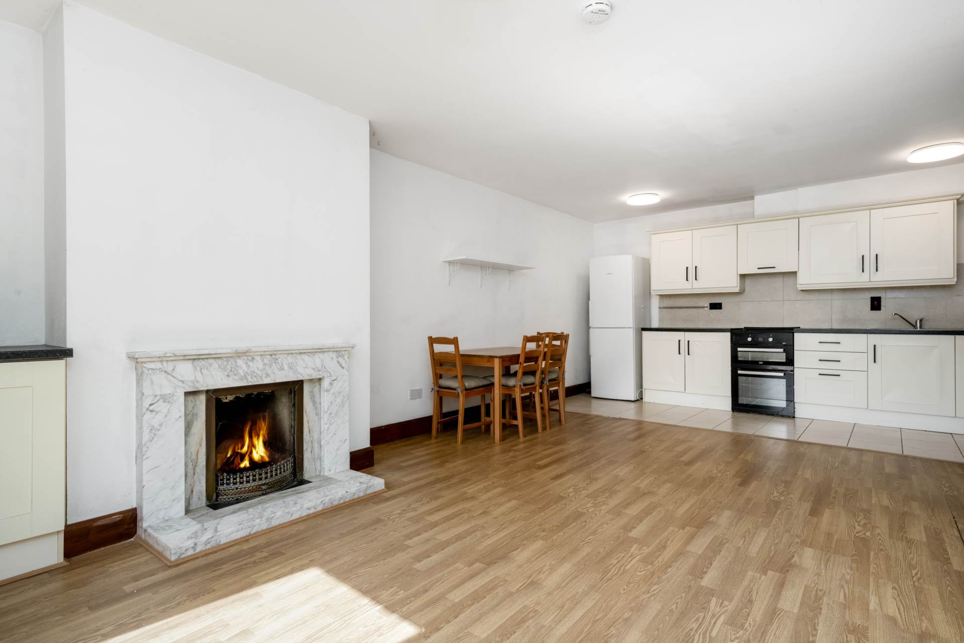 Bright reception room with laminate wooden floor, marble open fire place, built in storage and open plan to the kitchen.