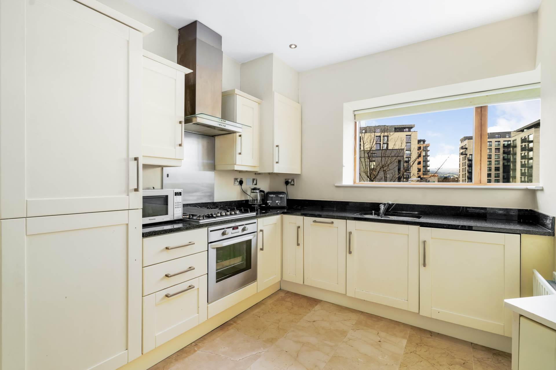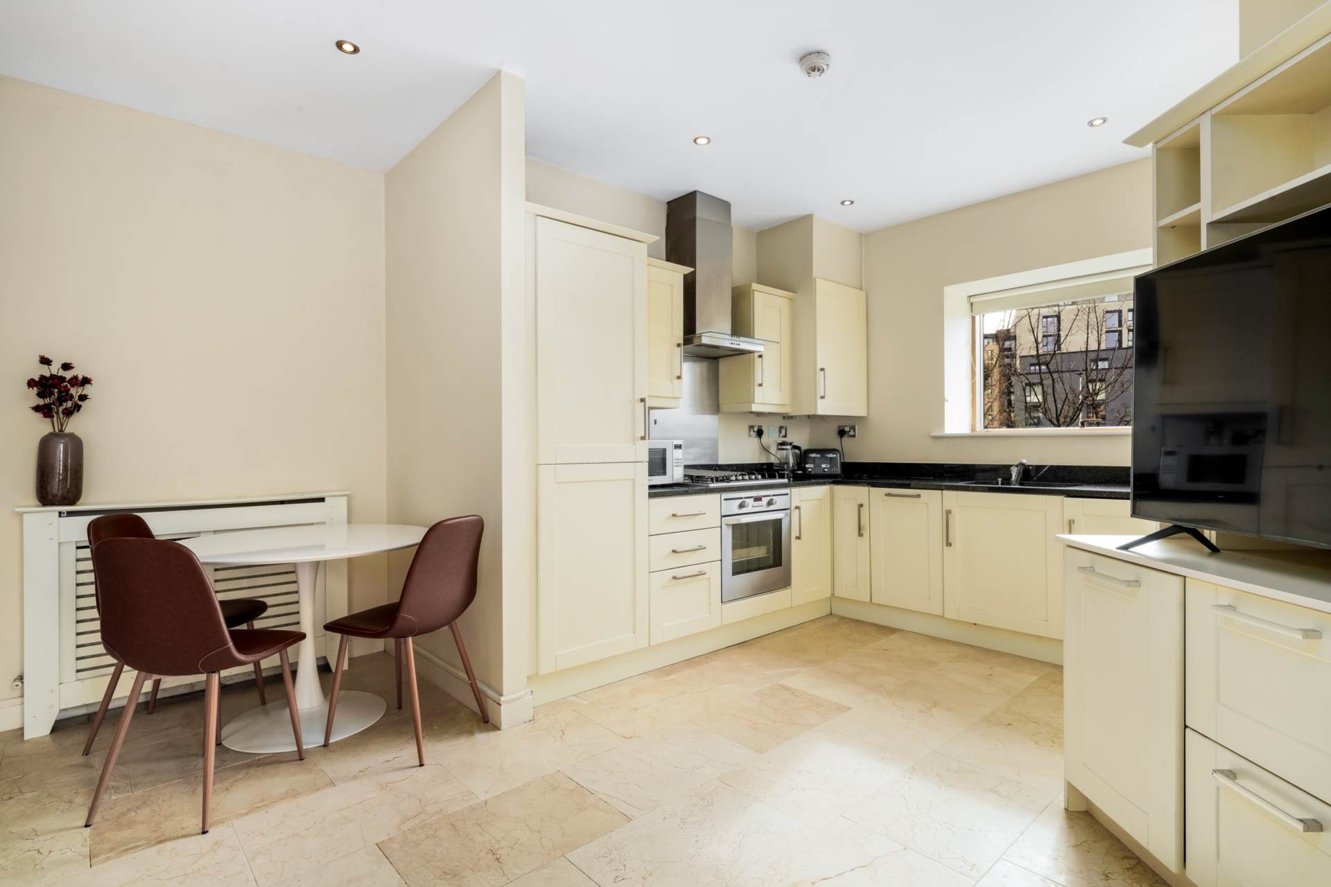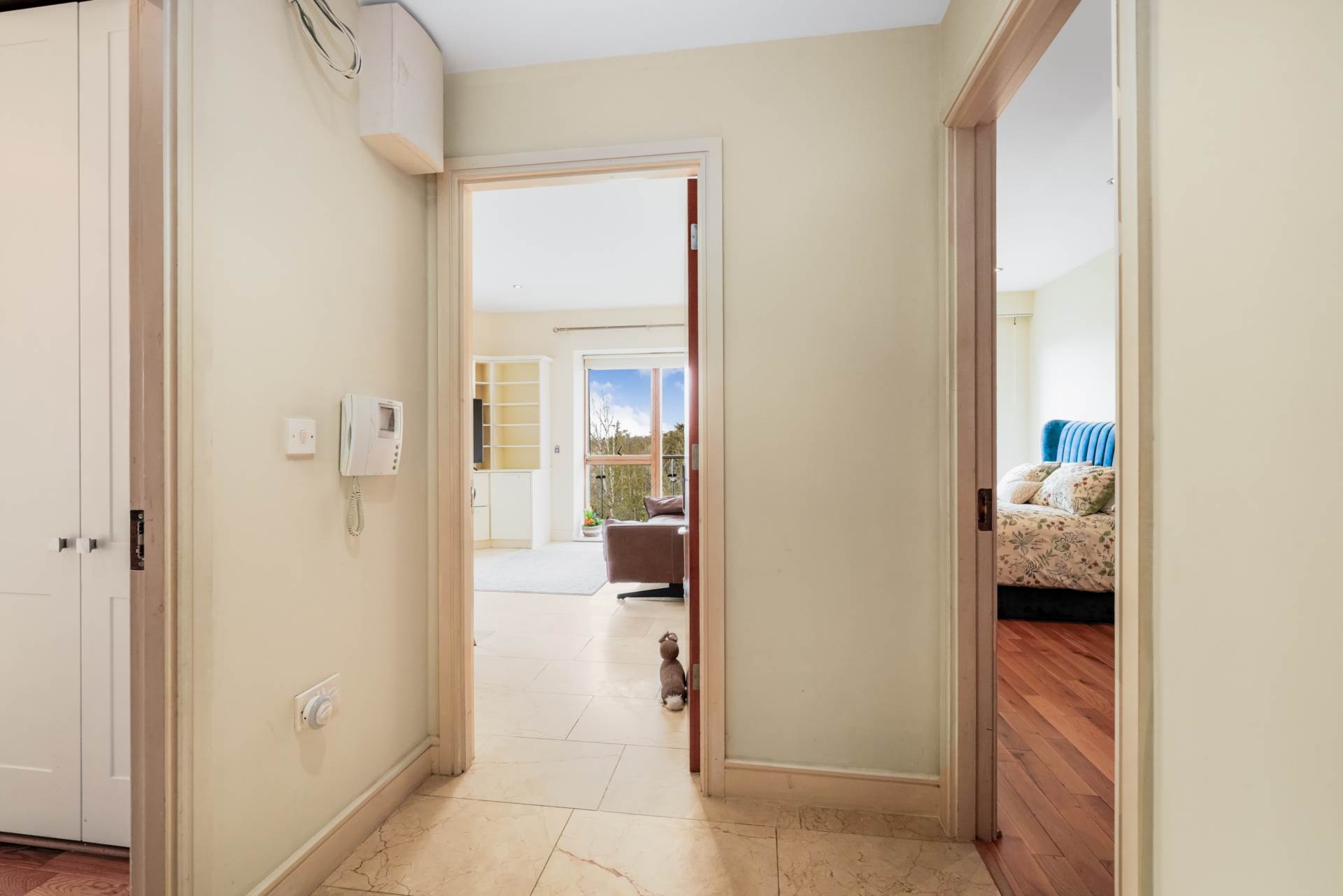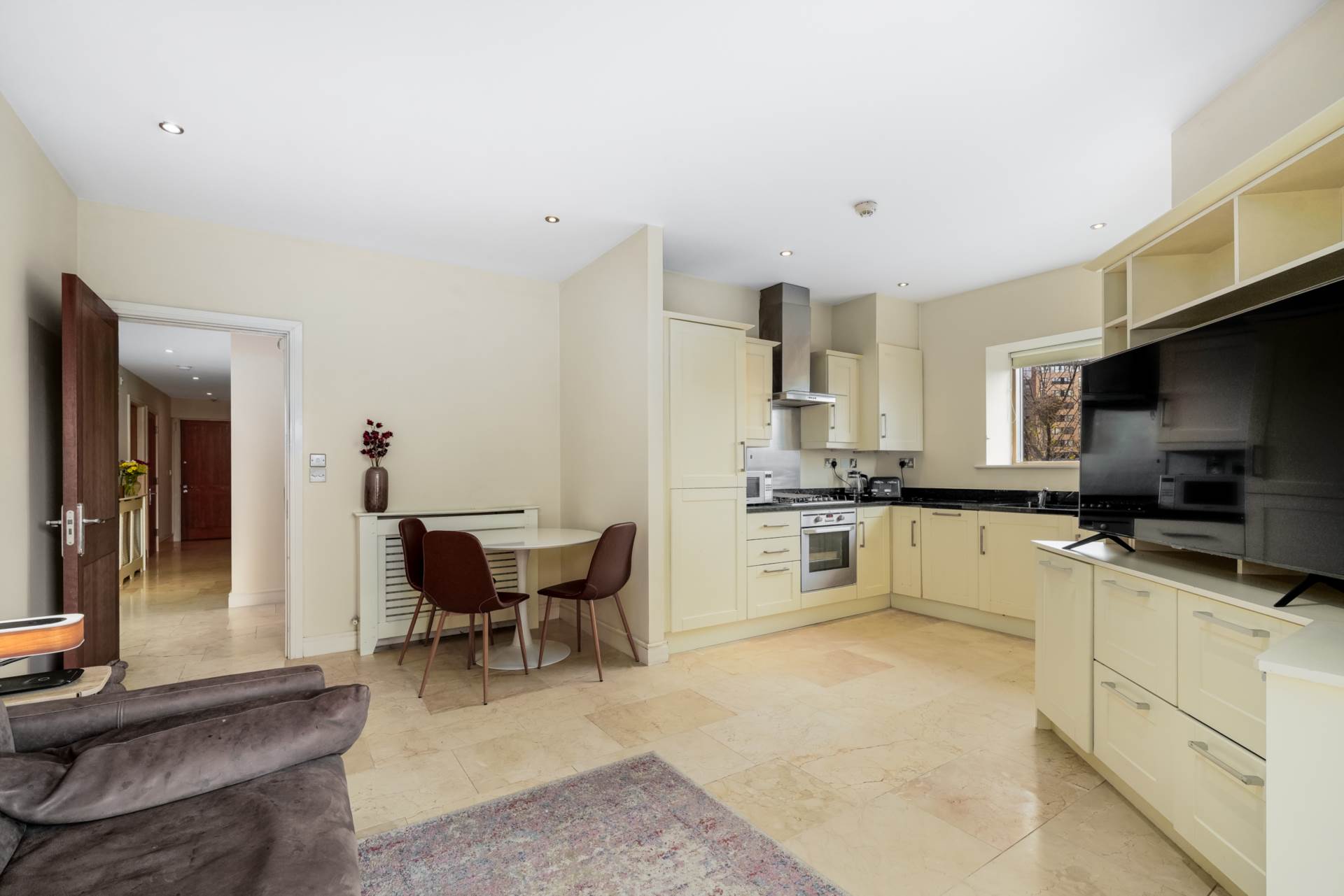 Finished with marble flooring throughout, the apartment is designed for both comfort and style. Underfloor heating in both bathrooms adds an extra touch of convenience. Large dual-aspect windows allow plenty of natural light into the open-plan kitchen, dining, living area.