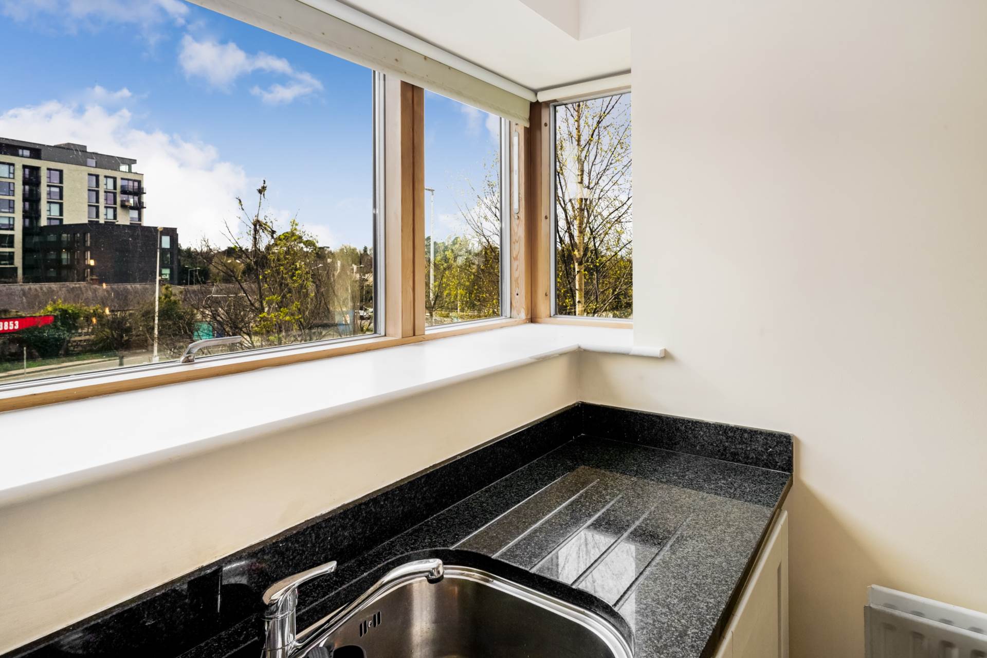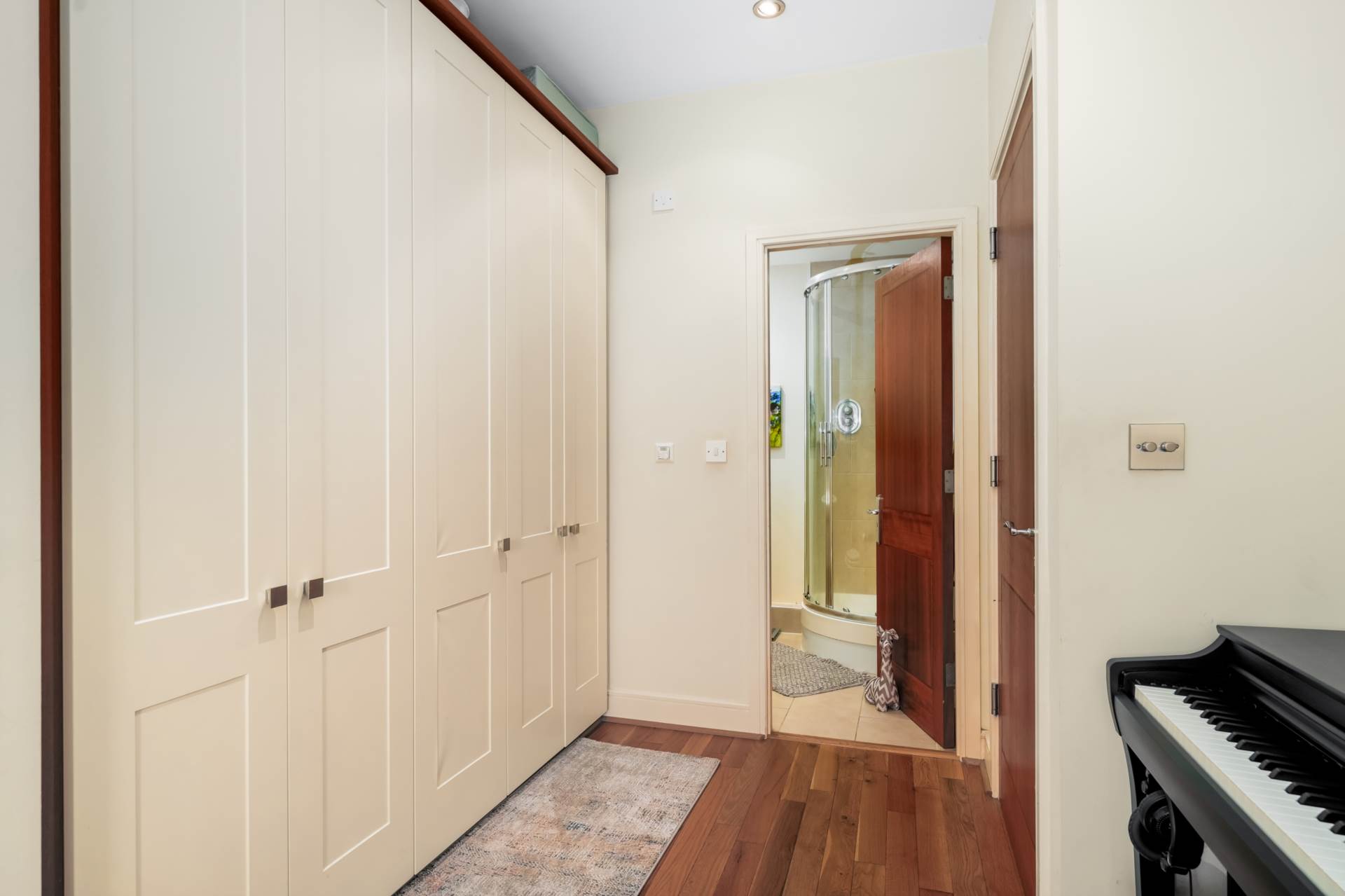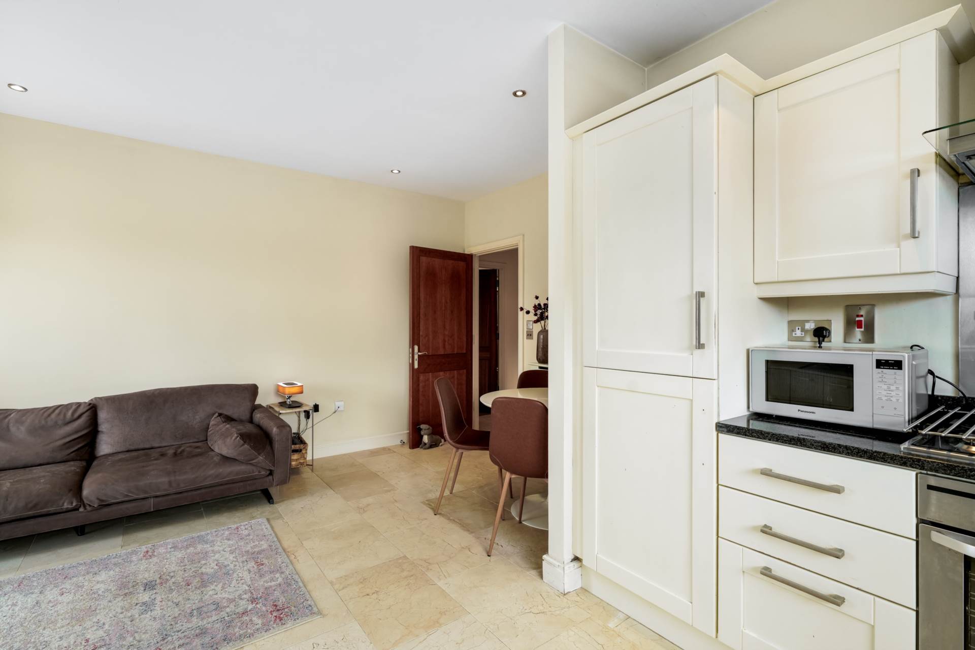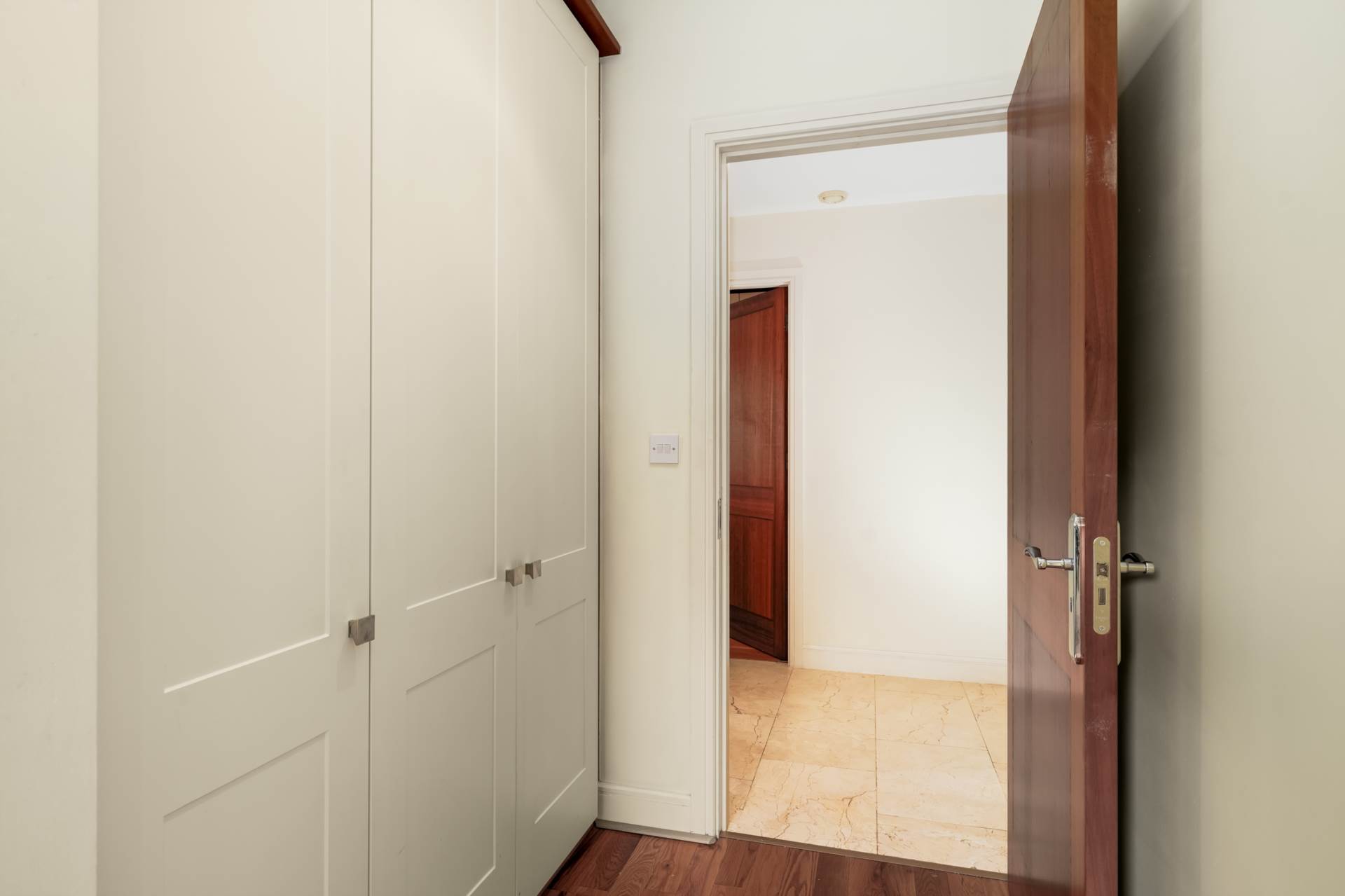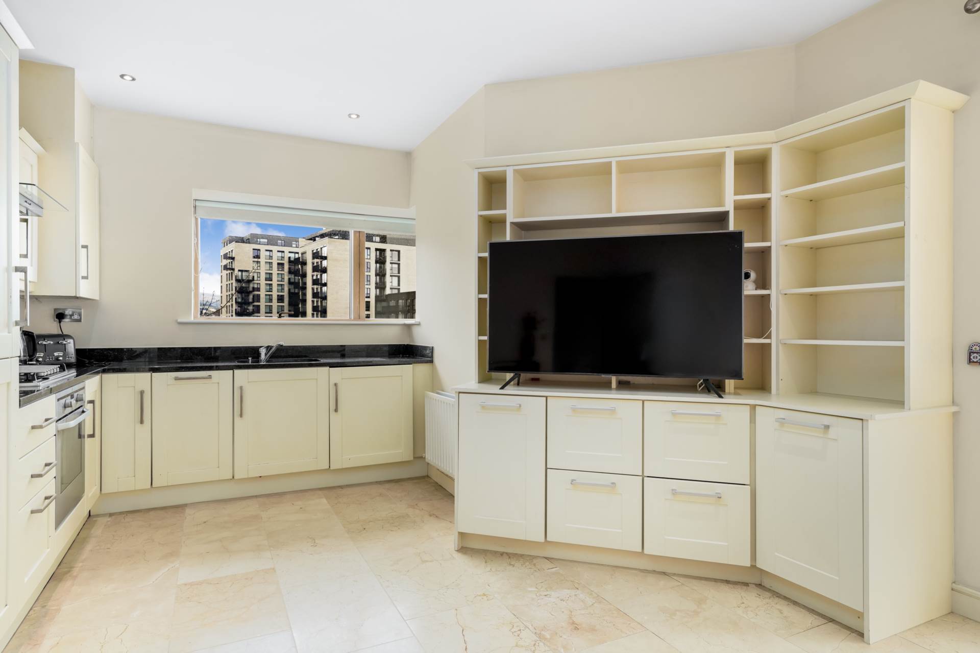 Finished with marble flooring throughout, the apartment is designed for both comfort and style. Underfloor heating in both bathrooms adds an extra touch of convenience. Large dual-aspect windows allow plenty of natural light into the open-plan kitchen, dining, living area.
