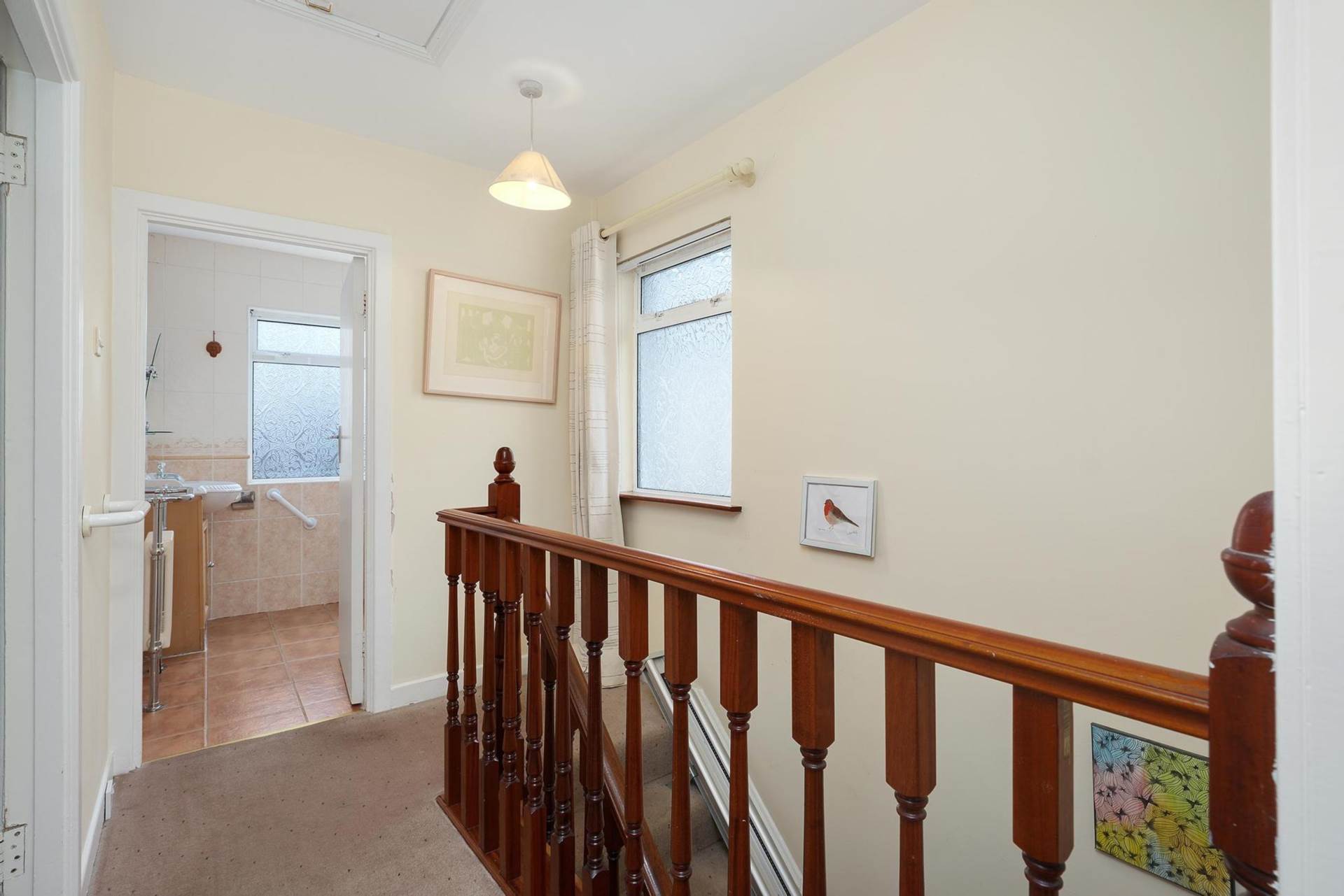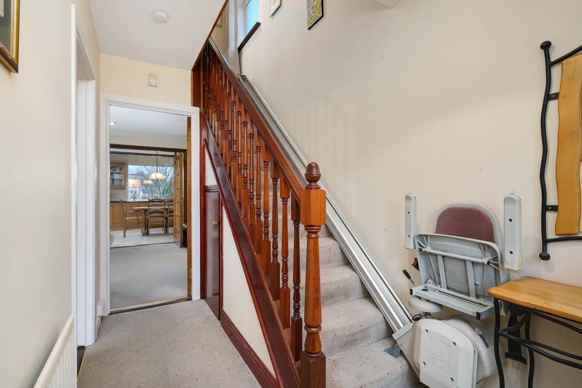 Teak hardwood front door. Carpeted hall, stairs and landing.