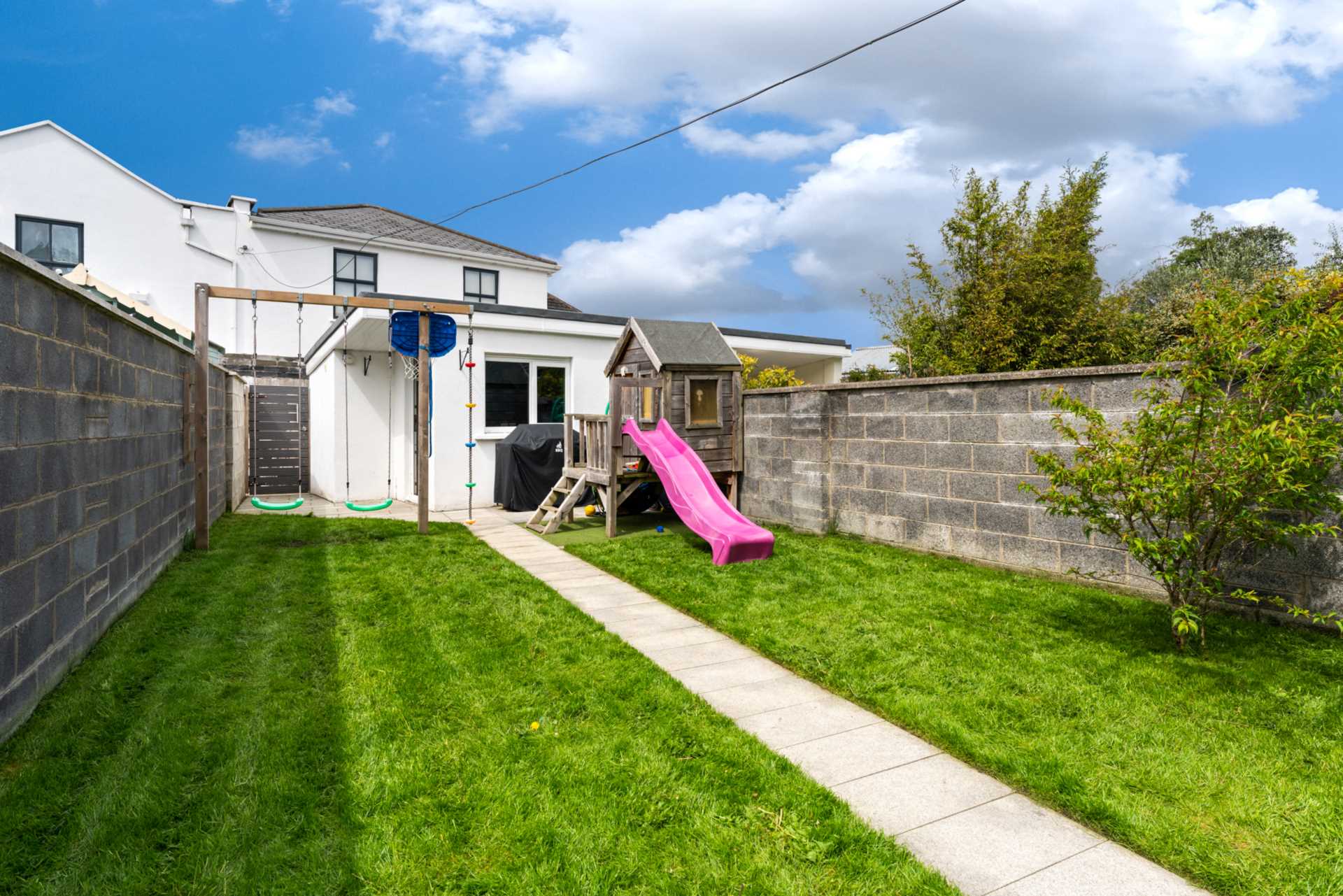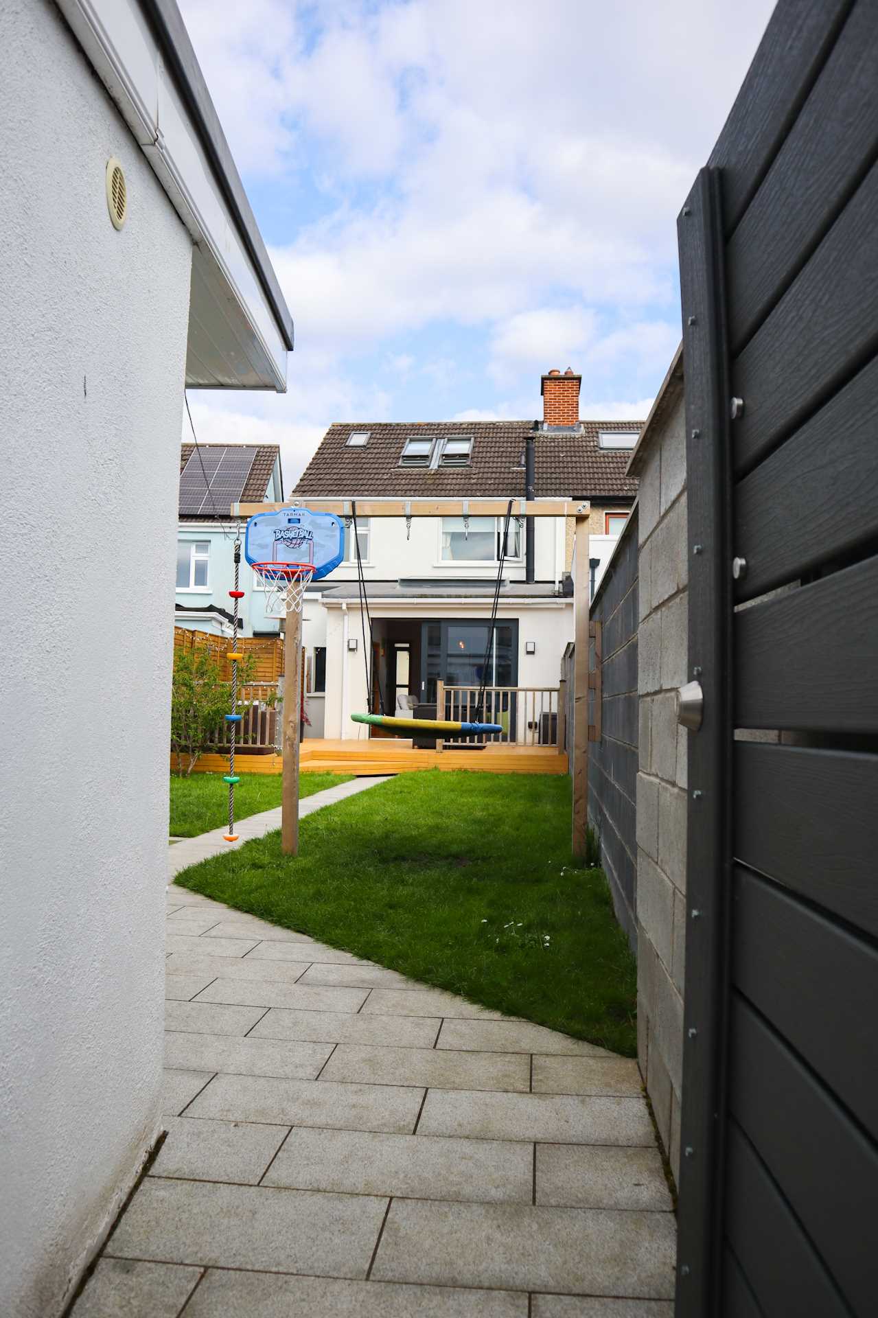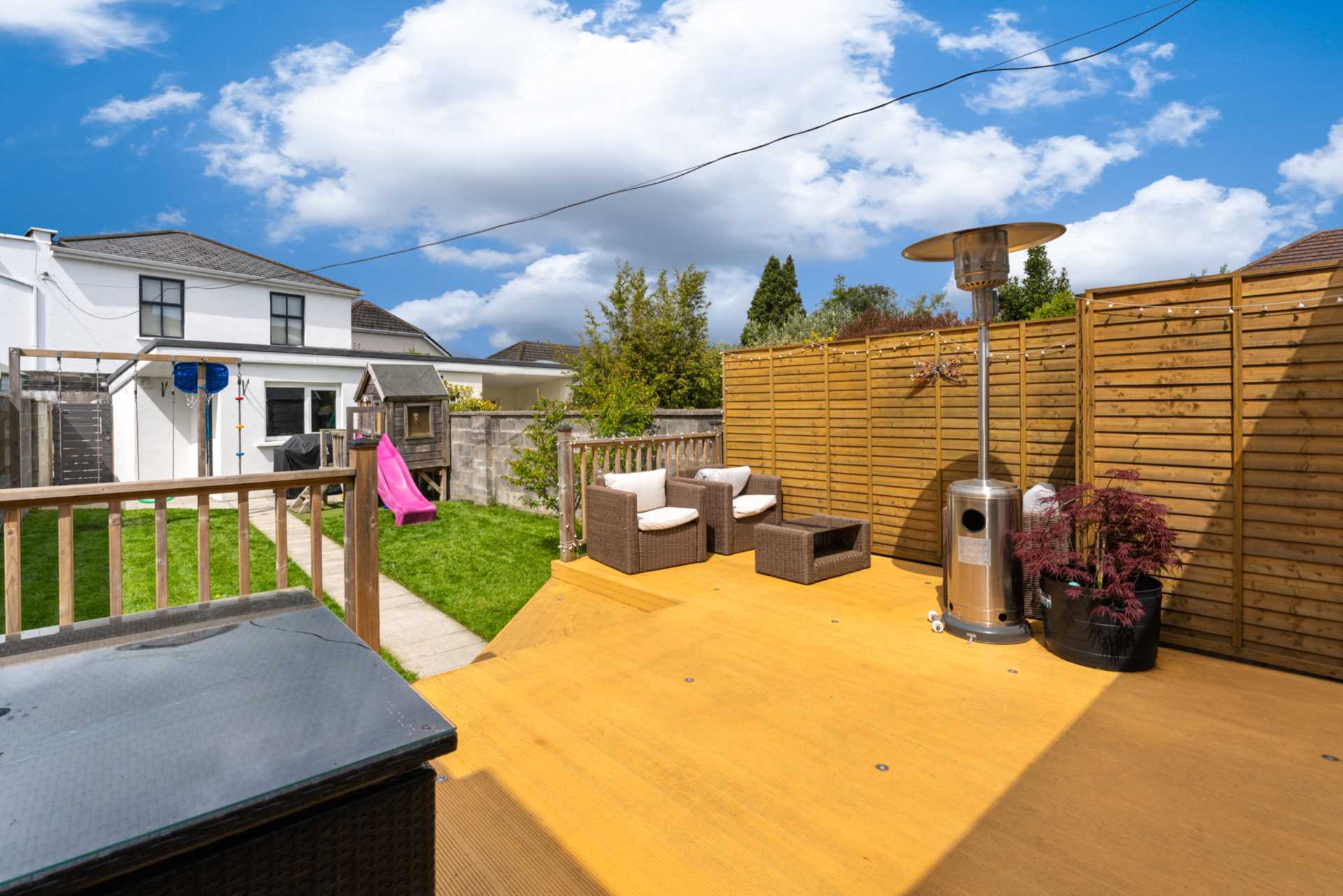 Westerly facing back garden with large composite deck, Manicured lawn and granite paving stones forming a garden path leading to a block built shed. Side access gate. Gate to secure back laneway. Laneway is wide enough for a vehicle. It is accessed via a gated entrance beside #2.