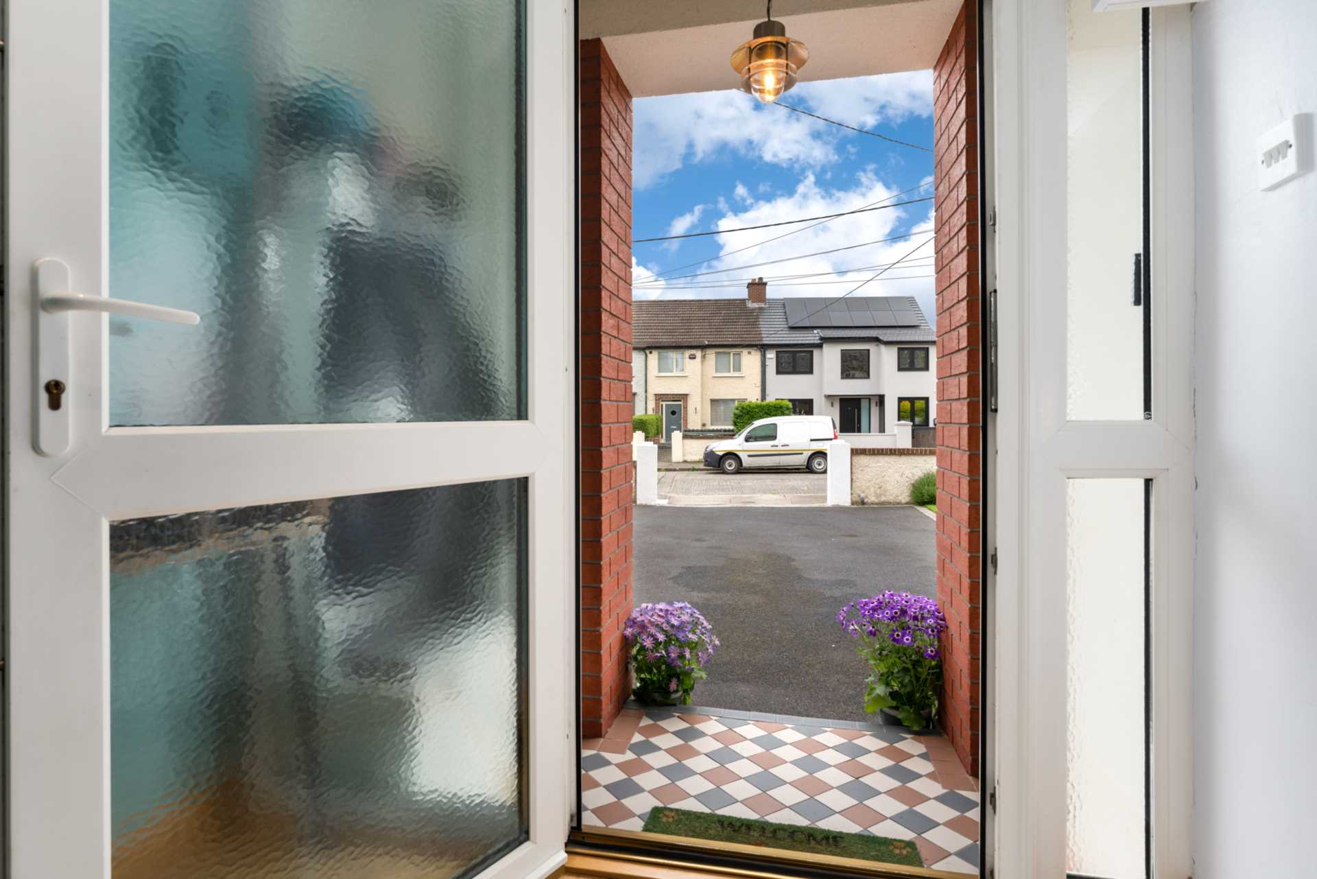 Covered porch with tiled floor. Light fitting.