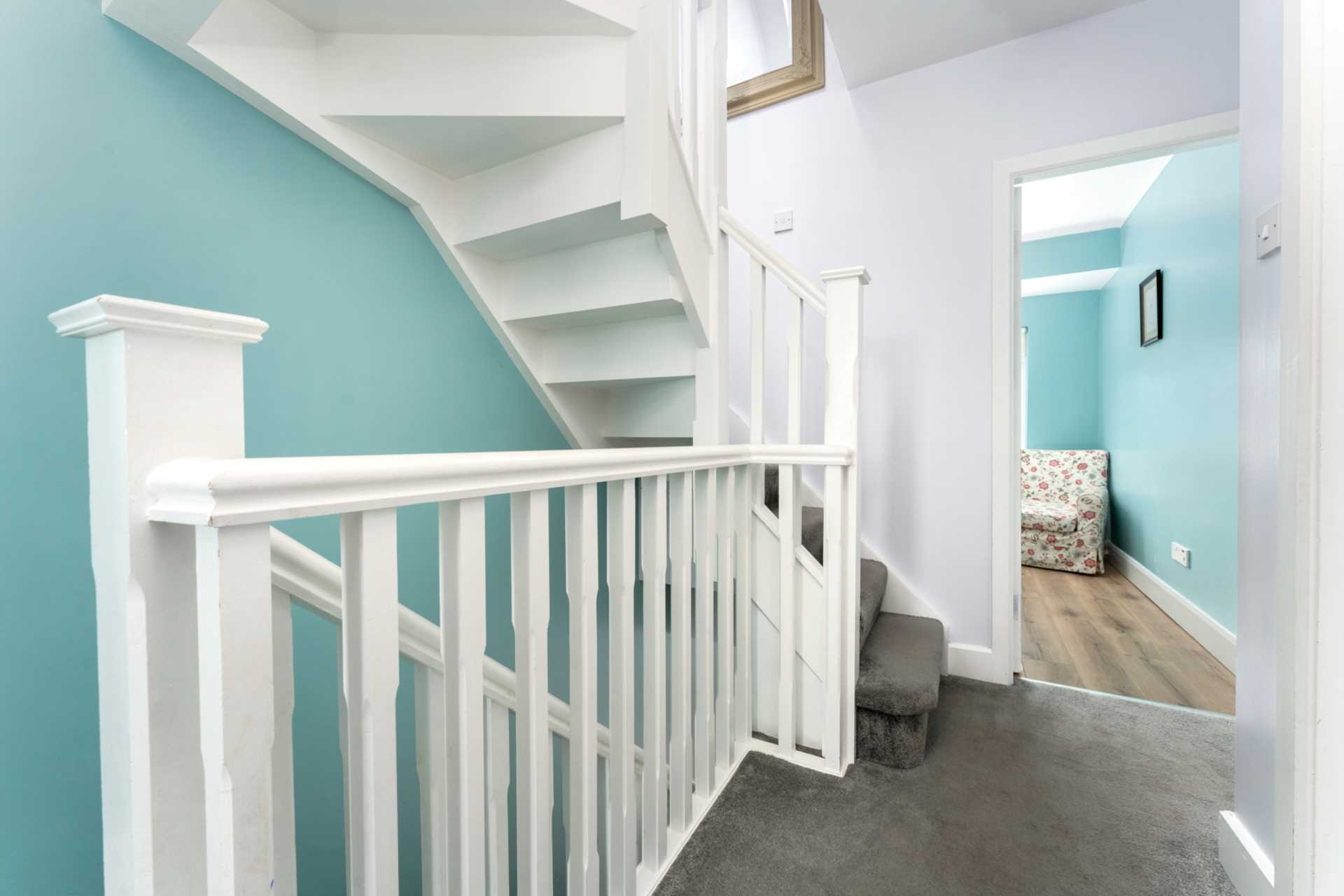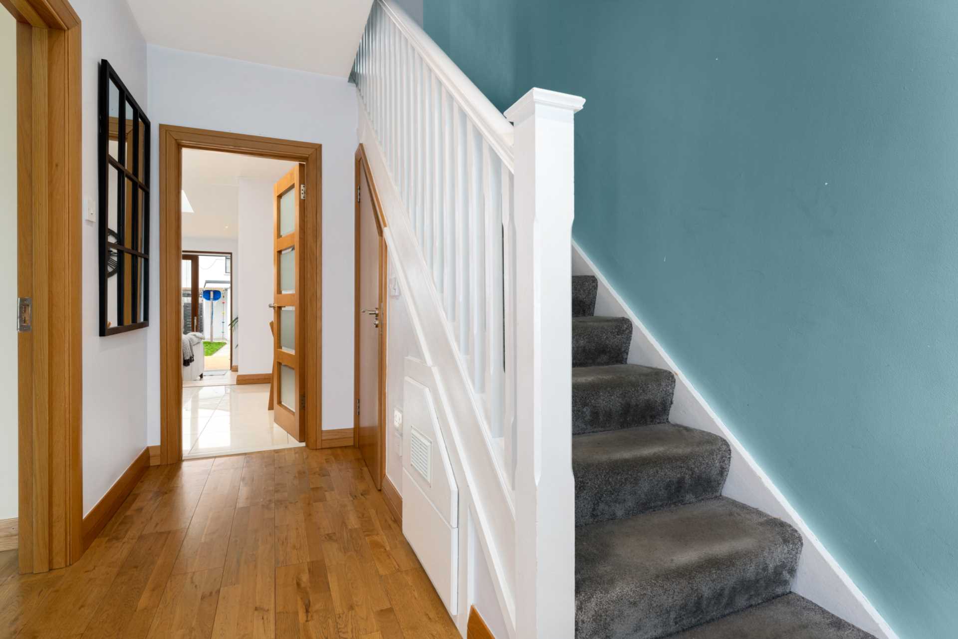 Oak flooring. Under stairs storage. Door to guest WC. carpeted stairs. Wood banisters.