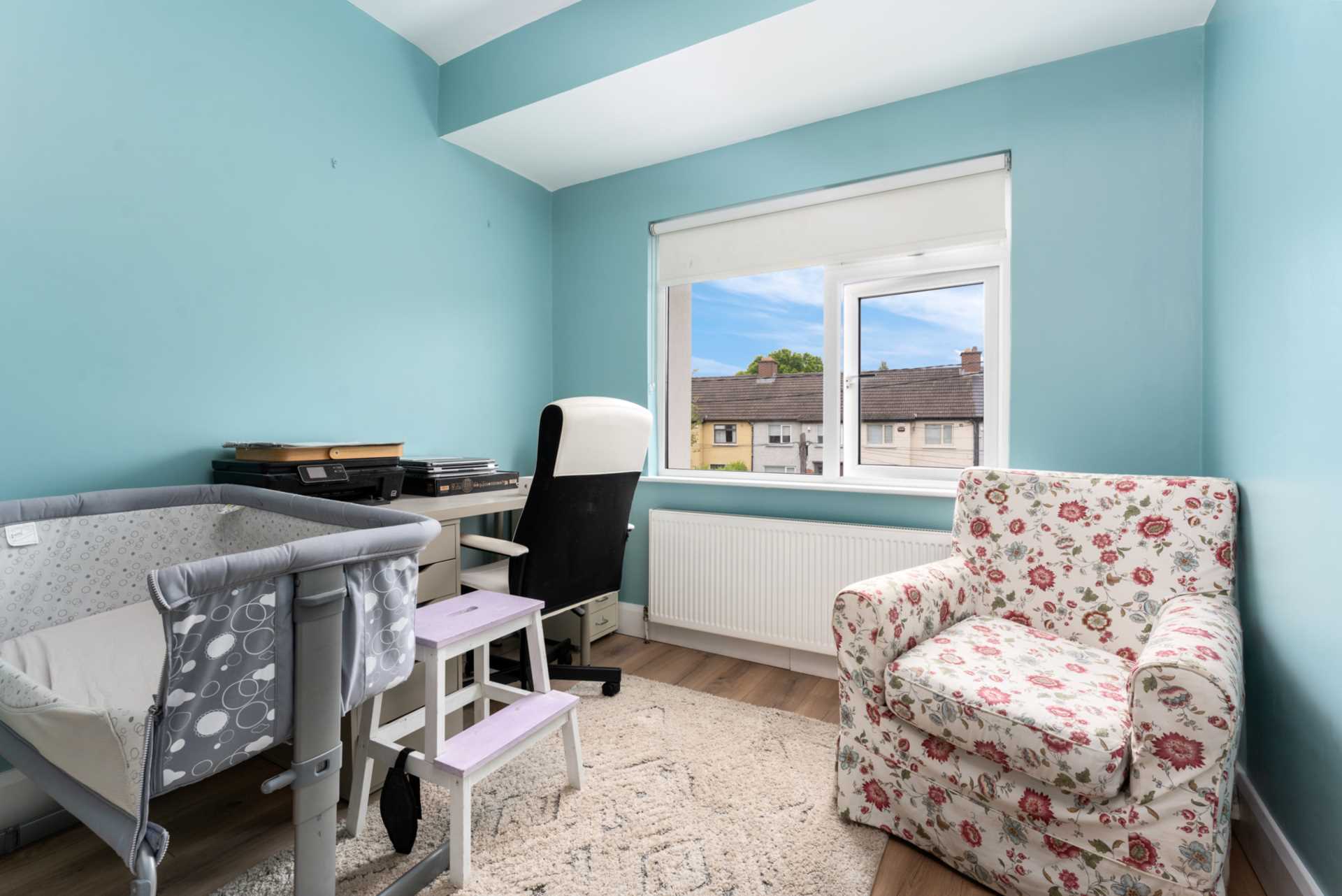 The upstairs was remodelled to give extra space in this room. Fitted wardrobe. High quality wood laminate flooring. Window with blinds.