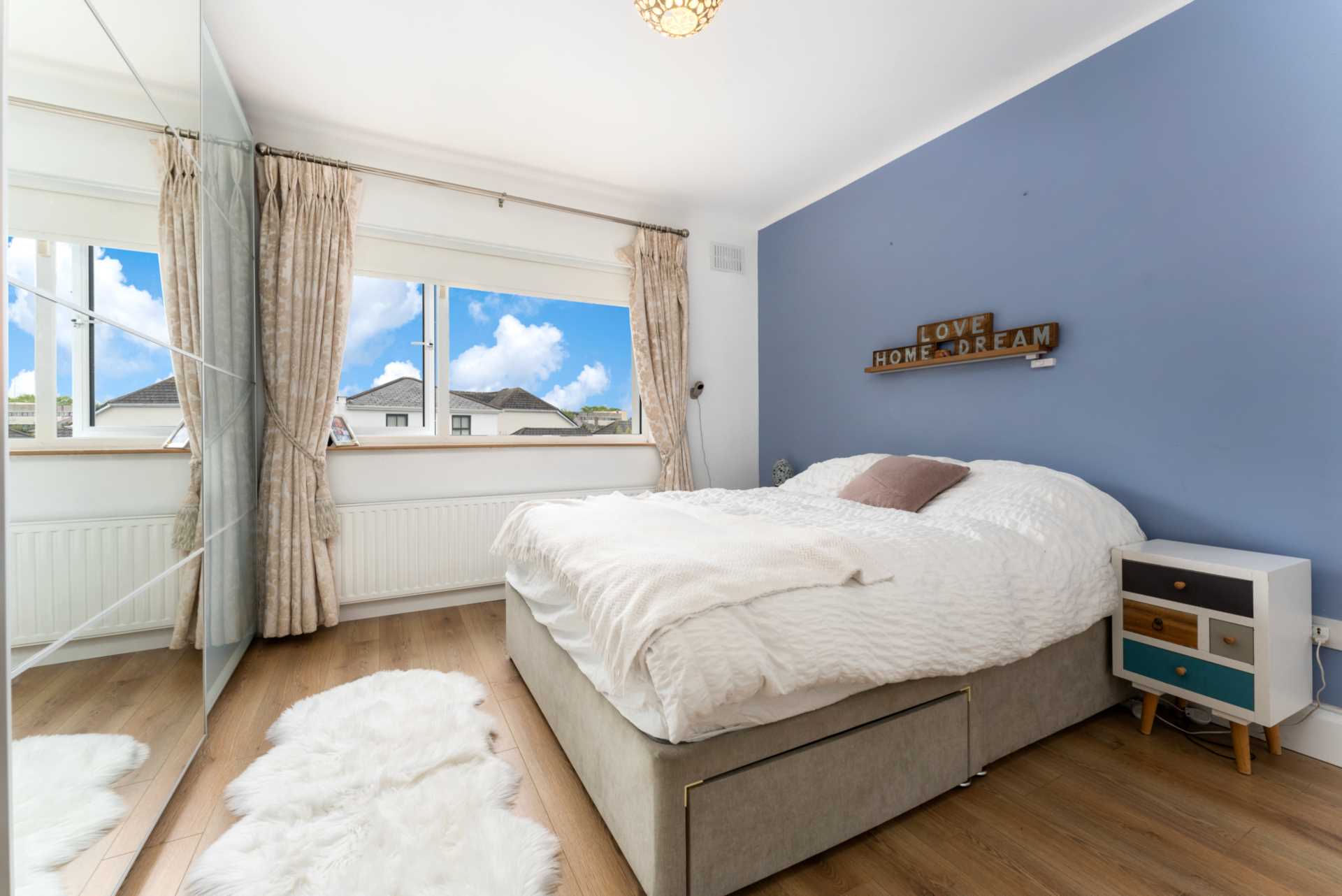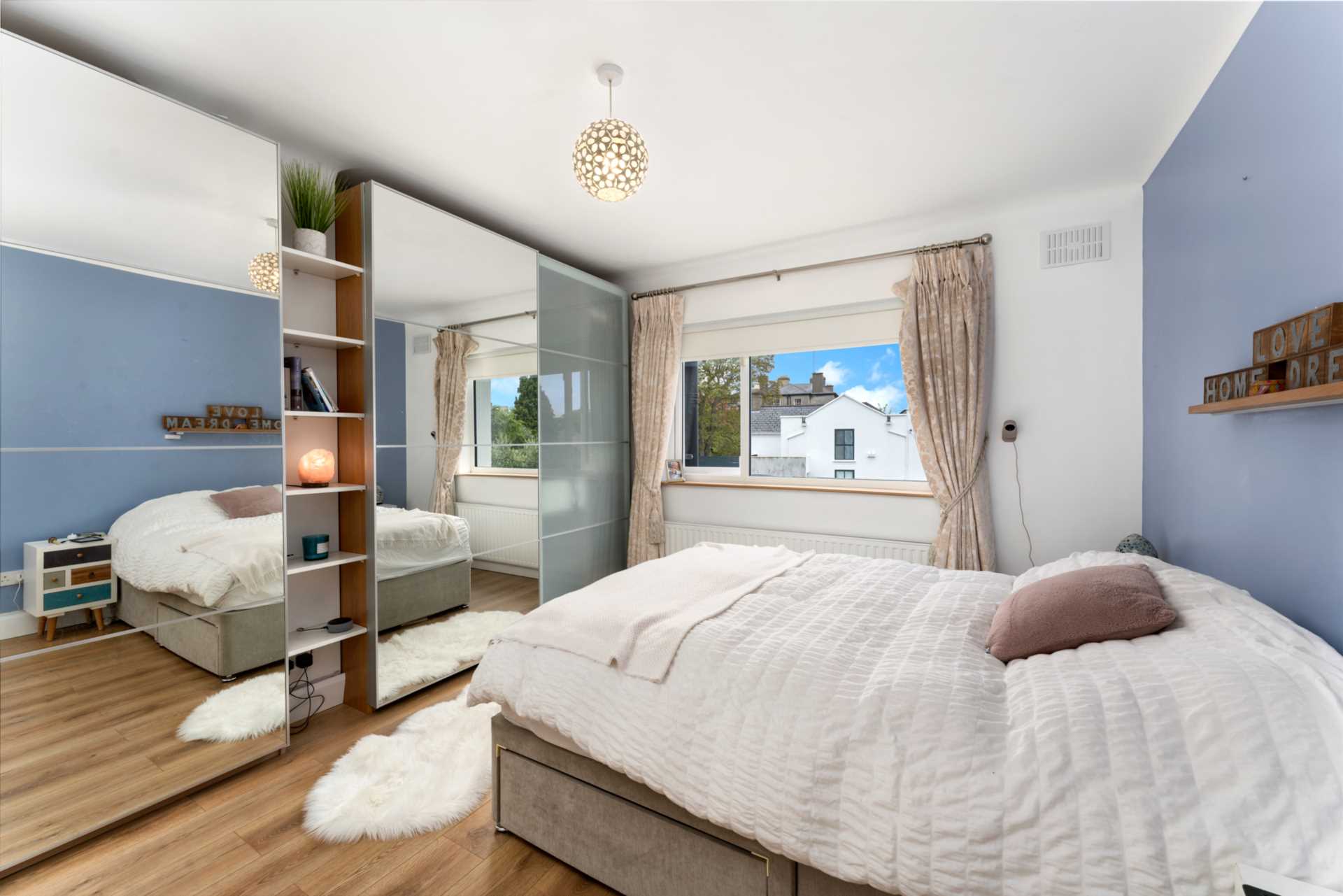 Large window to rear. Mirrored sliderobes with display shelving. High quality wood laminate flooring. Curtains, curtain rod and blinds.