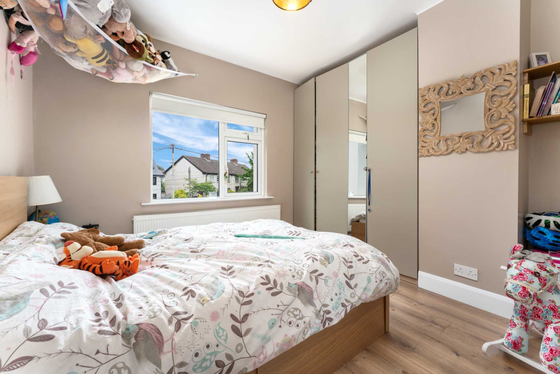 Fitted wardrobe with mirrored panel. High quality wood laminate flooring. Window with blinds.