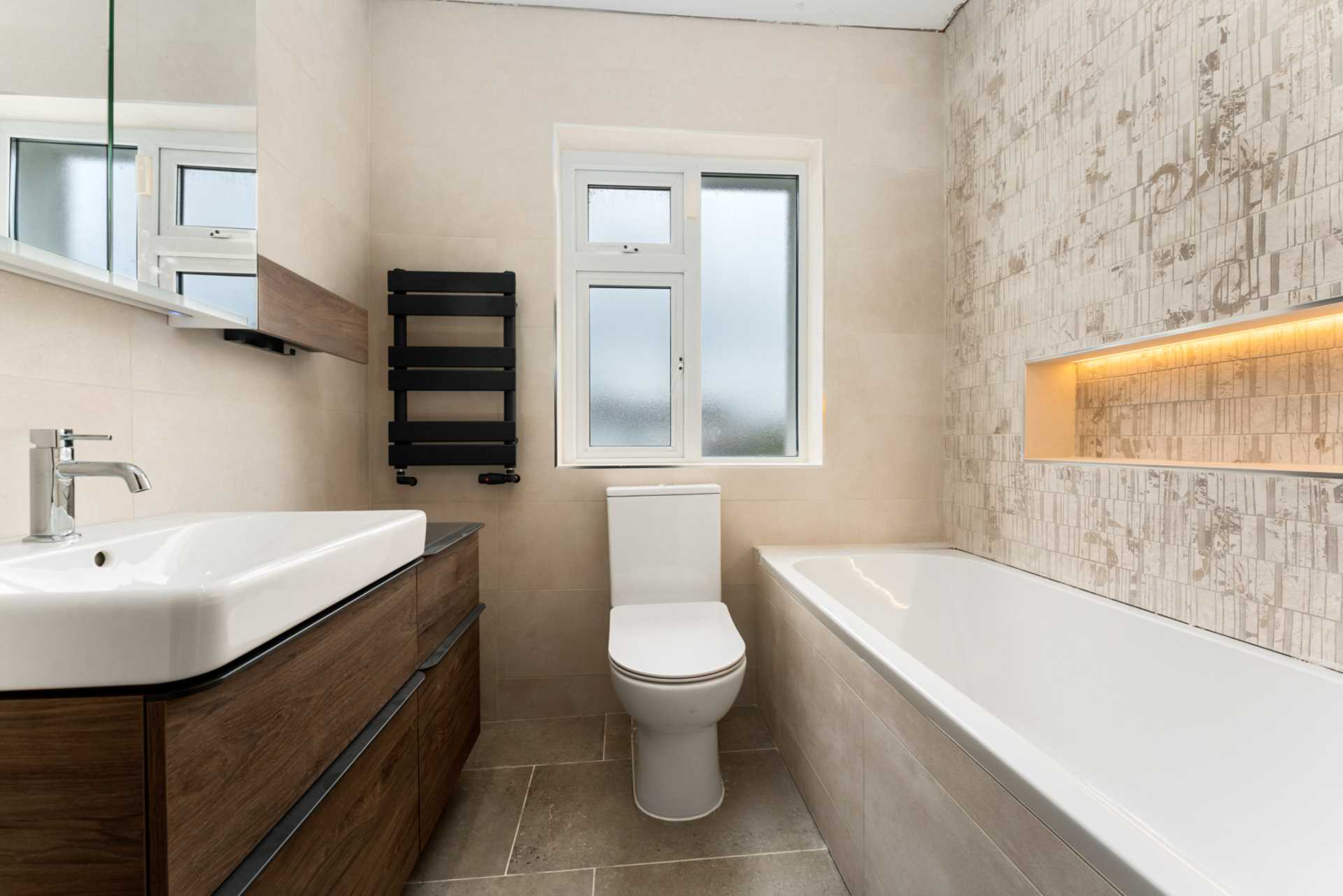 Modern fully tiled bathroom. Full size bathtub with glass shower screen and electric shower. Heated towel rail. WHB with cabinet underneath. Recessed lighting. Mirrored medicine cabinet. Lit soap/shampoo shelf.